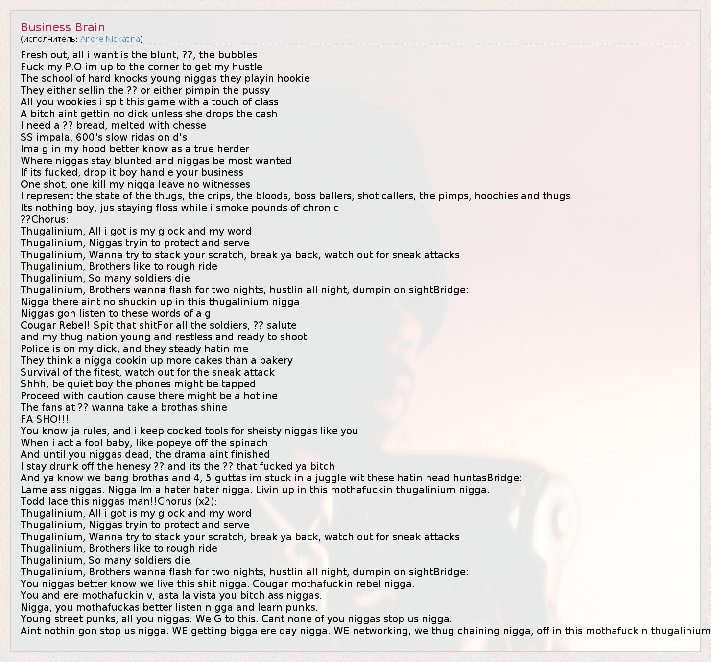 Это интересно:Андре Адамс, более известный под своим сценическим псевдонимом Андре Nickatina, американский рэппер из Сан-Франциско, штат Калифорния. Ранее он проводится под сценическим псевдонимом Dre Dog.Андре Адамс принял участие в "Галилео" Академии наук и технологий, но бросил, он утверждает, что был среднего D Он выпустил два альбома под псевдонимом Dre Dog: Новые Джим Джонс в 1993 году и I Hate You со... продолжение