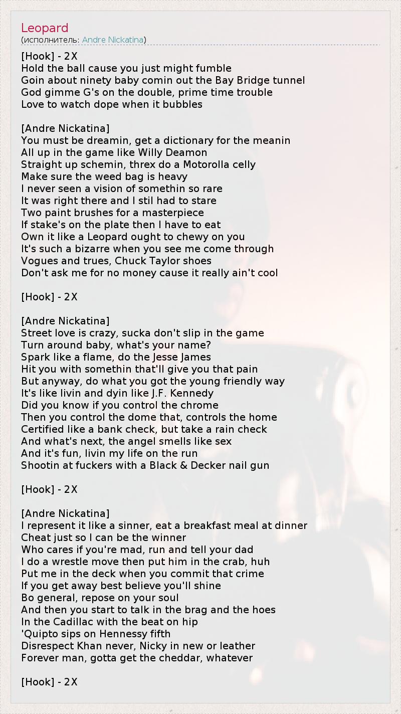 Это интересно:Андре Адамс, более известный под своим сценическим псевдонимом Андре Nickatina, американский рэппер из Сан-Франциско, штат Калифорния. Ранее он проводится под сценическим псевдонимом Dre Dog.Андре Адамс принял участие в "Галилео" Академии наук и технологий, но бросил, он утверждает, что был среднего D Он выпустил два альбома под псевдонимом Dre Dog: Новые Джим Джонс в 1993 году и I Hate You со... продолжение