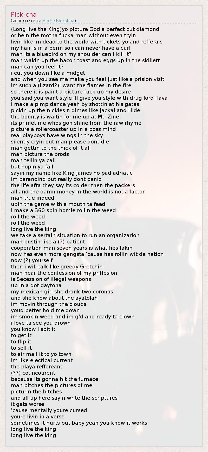 (Long live the King)yo picture God a perfect cut diamond or bein the motha fucka man without even tryin livin like im dead to the world with tickets yo and refferals my hair is in a perm so i can never have a curl man its a bluebird on my shoulder can i kill it? man wakin up the bacon toast and eggs up in the skillett man can you feel it? i cut you down like a midget and when you see me make you feel just like a prision visit im such a (lizard?)i want the flames in the fire so there it is paint a picture fuck up my desire you said you want style ill give you style with drug lord flava i make a pimp dance yeah by shottin at his gatas pickin up the nickles n dimes like Jackal and Hide the bounty is waitin for me up at Mt. Zine its primetime whos gon shine from the raw rhyme picture a rollercoaster up in a boss mind real playboys have wings in the sky silently cryin out man please dont die man gettin to the thick of it all man picture the brods man tellin ya call but hopin ya fall sayin my name like King James no pad adriatic im paranoind but really dont panic the life afta they say its colder then the packers all and the damn money in the world is not a factor man true indeed upin the game with a mouth ta feed i make a 360 spin homie rollin the weed roll the weed roll the weed long live the king we take a sertain situation to run an organizarion man bustin like a (?) patient cooperation man seven years is what hes fakin now hes even more gangsta 'cause hes rollin wit da nation now (?) yourself then i will talk like greedy Gretchin man hear the confession of my priffesion is Secession of illegal weapons up in a dot daytona my mexican girl she drank two coronas and she know about the ayatolah im movin through the clouds youd better hold me down im smokin weed and im g'd and ready ta clown i love ta see you drown you know I spit it to get it to flip it to sell it to air mail it to yo town im like electical current the playa reffereant (??) councourent because its gonna hit the furnace man pitches the pictures of me picturin the bitches and all up here sayin write the scriptures it gets worse 'cause mentally youre cursed youre livin in a verse sometimes it hurts but baby yeah you know it works long live the king long live the king