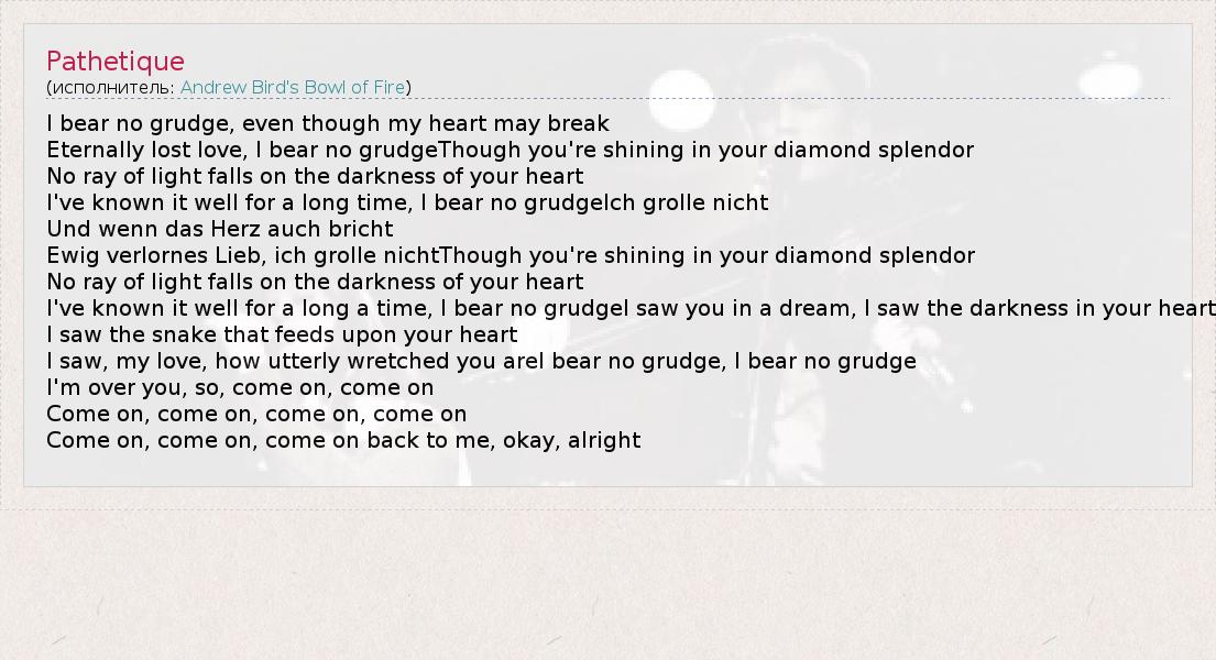 I bear no grudge, even though my heart may break Eternally lost love, I bear no grudgeThough you're shining in your diamond splendor No ray of light falls on the darkness of your heart I've known it well for a long time, I bear no grudgeIch grolle nicht Und wenn das Herz auch bricht Ewig verlornes Lieb, ich grolle nichtThough you're shining in your diamond splendor No ray of light falls on the darkness of your heart I've known it well for a long a time, I bear no grudgeI saw you in a dream, I saw the darkness in your heart I saw the snake that feeds upon your heart I saw, my love, how utterly wretched you areI bear no grudge, I bear no grudge I'm over you, so, come on, come on Come on, come on, come on, come on Come on, come on, come on back to me, okay, alright