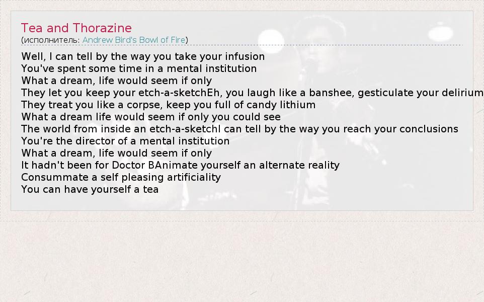 А как ты думаешь, о чем песня "Tea and Thorazine" ?