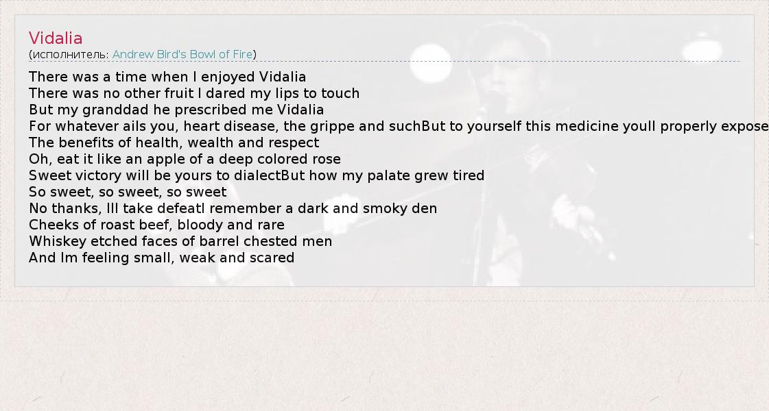 There was a time when I enjoyed Vidalia There was no other fruit I dared my lips to touch But my granddad he prescribed me Vidalia For whatever ails you, heart disease, the grippe and suchBut to yourself this medicine youll properly expose The benefits of health, wealth and respect Oh, eat it like an apple of a deep colored rose Sweet victory will be yours to dialectBut how my palate grew tired So sweet, so sweet, so sweet No thanks, Ill take defeatI remember a dark and smoky den Cheeks of roast beef, bloody and rare Whiskey etched faces of barrel chested men And Im feeling small, weak and scared