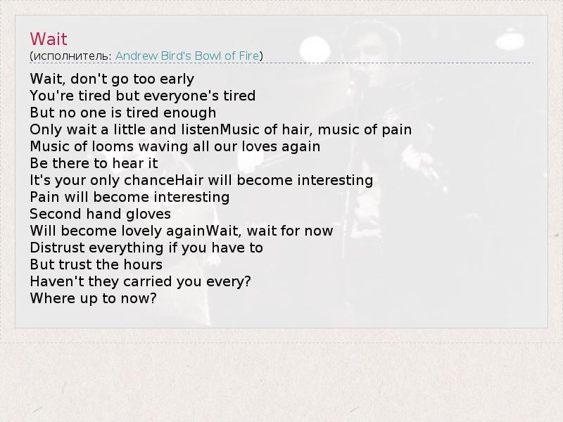 Wait, don't go too early You're tired but everyone's tired But no one is tired enough Only wait a little and listenMusic of hair, music of pain Music of looms waving all our loves again Be there to hear it It's your only chanceHair will become interesting Pain will become interesting Second hand gloves Will become lovely againWait, wait for now Distrust everything if you have to But trust the hours Haven't they carried you every? Where up to now?