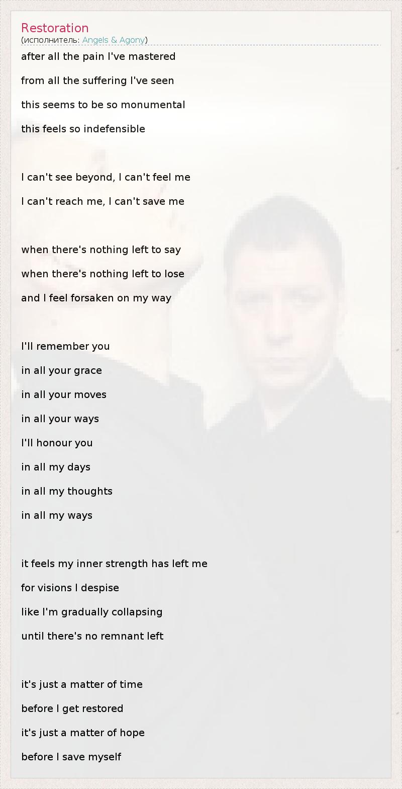 after all the pain I've mastered from all the suffering I've seen this seems to be so monumental this feels so indefensible I can't see beyond, I can't feel me I can't reach me, I can't save me when there's nothing left to say when there's nothing left to lose and I feel forsaken on my way I'll remember you in all your grace in all your moves in all your ways I'll honour you in all my days in all my thoughts in all my ways it feels my inner strength has left me for visions I despise like I'm gradually collapsing until there's no remnant left it's just a matter of time before I get restored it's just a matter of hope before I save myself