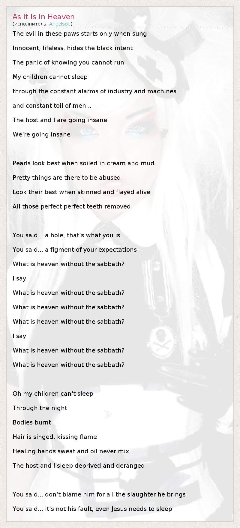 The evil in these paws starts only when sung Innocent, lifeless, hides the black intent The panic of knowing you cannot run My children cannot sleep through the constant alarms of industry and machines and constant toil of men... The host and I are going insane We're going insane Pearls look best when soiled in cream and mud Pretty things are there to be abused Look their best when skinned and flayed alive All those perfect perfect teeth removed You said... a hole, that's what you is You said... a figment of your expectations What is heaven without the sabbath? I say What is heaven without the sabbath? What is heaven without the sabbath? What is heaven without the sabbath? I say What is heaven without the sabbath? What is heaven without the sabbath? Oh my children can't sleep Through the night Bodies burnt Hair is singed, kissing flame Healing hands sweat and oil never mix The host and I sleep deprived and deranged You said... don't blame him for all the slaughter he brings You said... it's not his fault, even Jesus needs to sleep