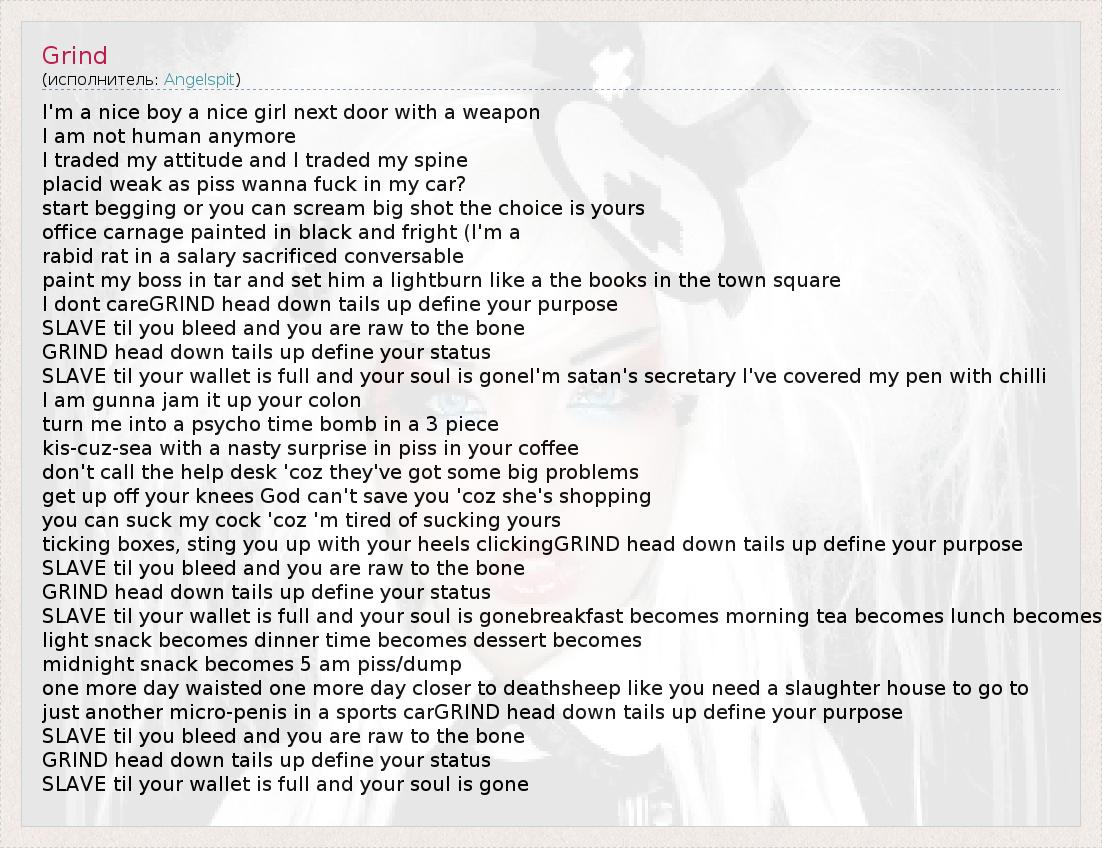 I'm a nice boy a nice girl next door with a weapon I am not human anymore I traded my attitude and I traded my spine placid weak as piss wanna fuck in my car? start begging or you can scream big shot the choice is yours office carnage painted in black and fright (I'm a rabid rat in a salary sacrificed conversable paint my boss in tar and set him a lightburn like a the books in the town square I dont careGRIND head down tails up define your purpose SLAVE til you bleed and you are raw to the bone GRIND head down tails up define your status SLAVE til your wallet is full and your soul is goneI'm satan's secretary I've covered my pen with chilli I am gunna jam it up your colon turn me into a psycho time bomb in a 3 piece kis-cuz-sea with a nasty surprise in piss in your coffee don't call the help desk 'coz they've got some big problems get up off your knees God can't save you 'coz she's shopping you can suck my cock 'coz 'm tired of sucking yours ticking boxes, sting you up with your heels clickingGRIND head down tails up define your purpose SLAVE til you bleed and you are raw to the bone GRIND head down tails up define your status SLAVE til your wallet is full and your soul is gonebreakfast becomes morning tea becomes lunch becomes light snack becomes dinner time becomes dessert becomes midnight snack becomes 5 am piss/dump one more day waisted one more day closer to deathsheep like you need a slaughter house to go to just another micro-penis in a sports carGRIND head down tails up define your purpose SLAVE til you bleed and you are raw to the bone GRIND head down tails up define your status SLAVE til your wallet is full and your soul is gone