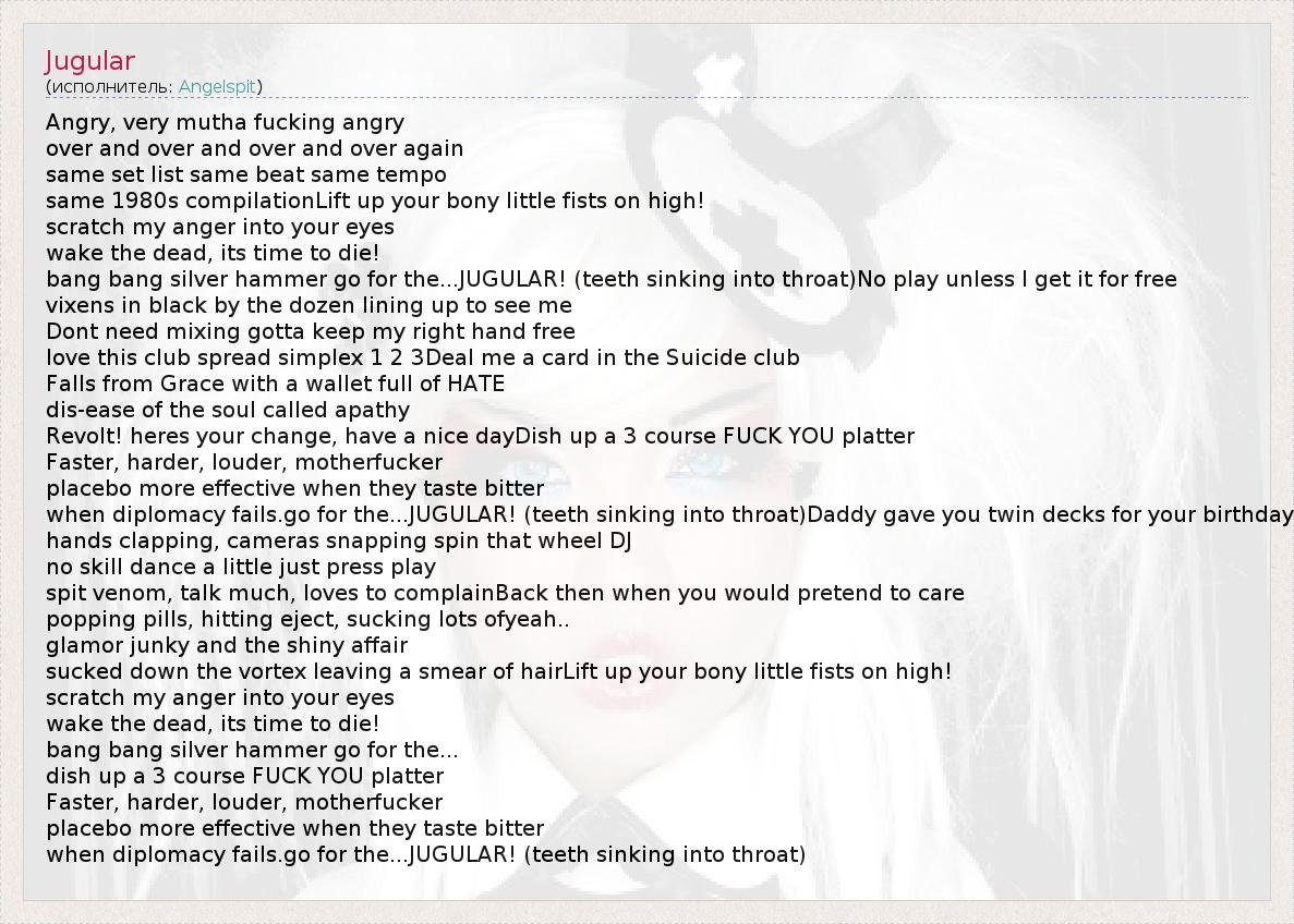Angry, very mutha fucking angry over and over and over and over again same set list same beat same tempo same 1980s compilationLift up your bony little fists on high! scratch my anger into your eyes wake the dead, its time to die! bang bang silver hammer go for the...JUGULAR! (teeth sinking into throat)No play unless I get it for free vixens in black by the dozen lining up to see me Dont need mixing gotta keep my right hand free love this club spread simplex 1 2 3Deal me a card in the Suicide club Falls from Grace with a wallet full of HATE dis-ease of the soul called apathy Revolt! heres your change, have a nice dayDish up a 3 course FUCK YOU platter Faster, harder, louder, motherfucker placebo more effective when they taste bitter when diplomacy fails.go for the...JUGULAR! (teeth sinking into throat)Daddy gave you twin decks for your birthday hands clapping, cameras snapping spin that wheel DJ no skill dance a little just press play spit venom, talk much, loves to complainBack then when you would pretend to care popping pills, hitting eject, sucking lots ofyeah.. glamor junky and the shiny affair sucked down the vortex leaving a smear of hairLift up your bony little fists on high! scratch my anger into your eyes wake the dead, its time to die! bang bang silver hammer go for the... dish up a 3 course FUCK YOU platter Faster, harder, louder, motherfucker placebo more effective when they taste bitter when diplomacy fails.go for the...JUGULAR! (teeth sinking into throat)