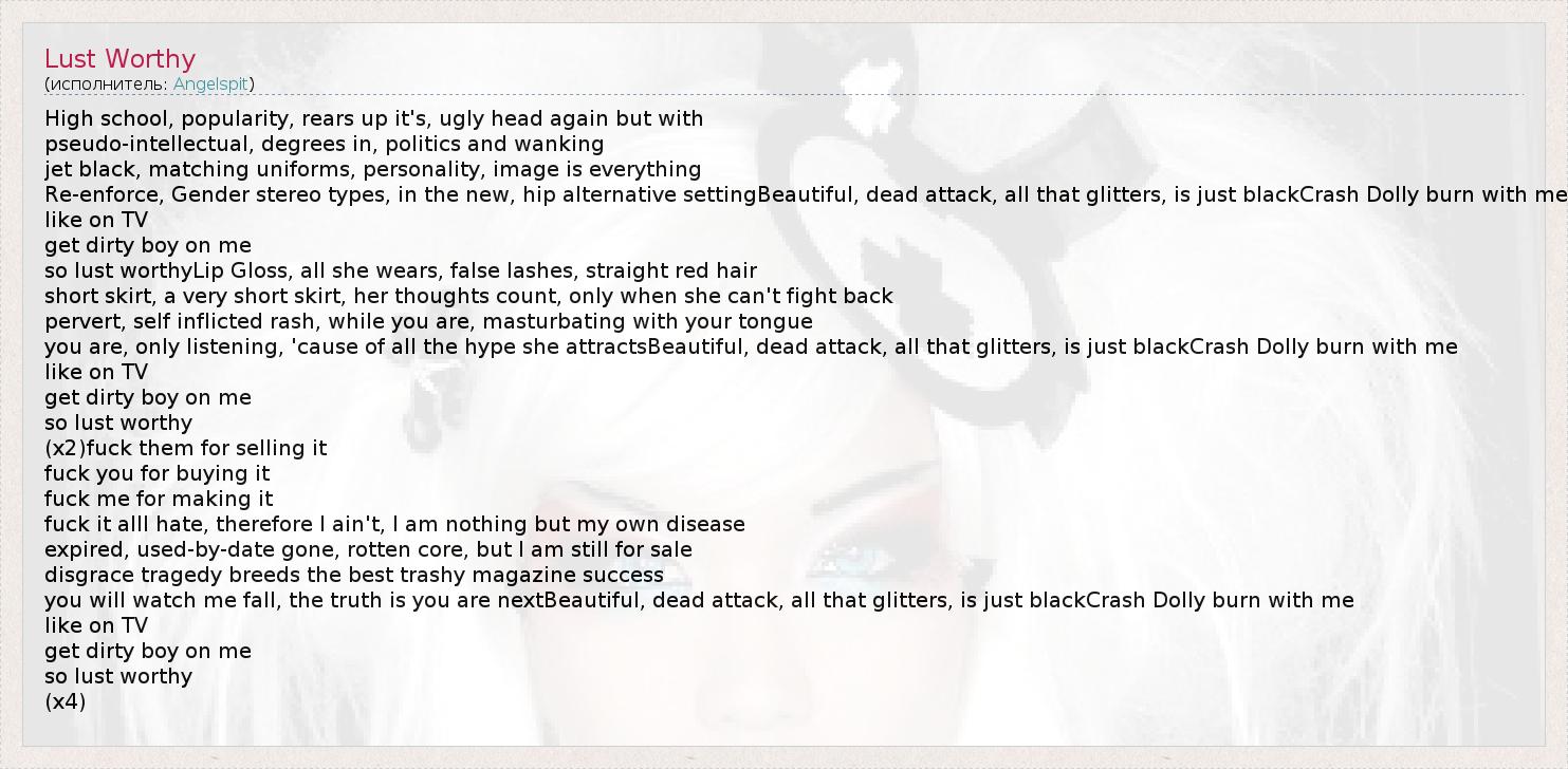 High school, popularity, rears up it's, ugly head again but with pseudo-intellectual, degrees in, politics and wanking jet black, matching uniforms, personality, image is everything Re-enforce, Gender stereo types, in the new, hip alternative settingBeautiful, dead attack, all that glitters, is just blackCrash Dolly burn with me like on TV get dirty boy on me so lust worthyLip Gloss, all she wears, false lashes, straight red hair short skirt, a very short skirt, her thoughts count, only when she can't fight back pervert, self inflicted rash, while you are, masturbating with your tongue you are, only listening, 'cause of all the hype she attractsBeautiful, dead attack, all that glitters, is just blackCrash Dolly burn with me like on TV get dirty boy on me so lust worthy (x2)fuck them for selling it fuck you for buying it fuck me for making it fuck it allI hate, therefore I ain't, I am nothing but my own disease expired, used-by-date gone, rotten core, but I am still for sale disgrace tragedy breeds the best trashy magazine success you will watch me fall, the truth is you are nextBeautiful, dead attack, all that glitters, is just blackCrash Dolly burn with me like on TV get dirty boy on me so lust worthy (x4)