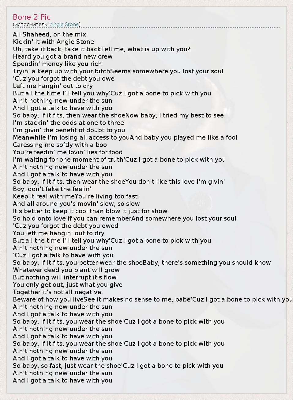 So baby, if it fits, you wear the shoe'Cuz I got a bone to pick with you