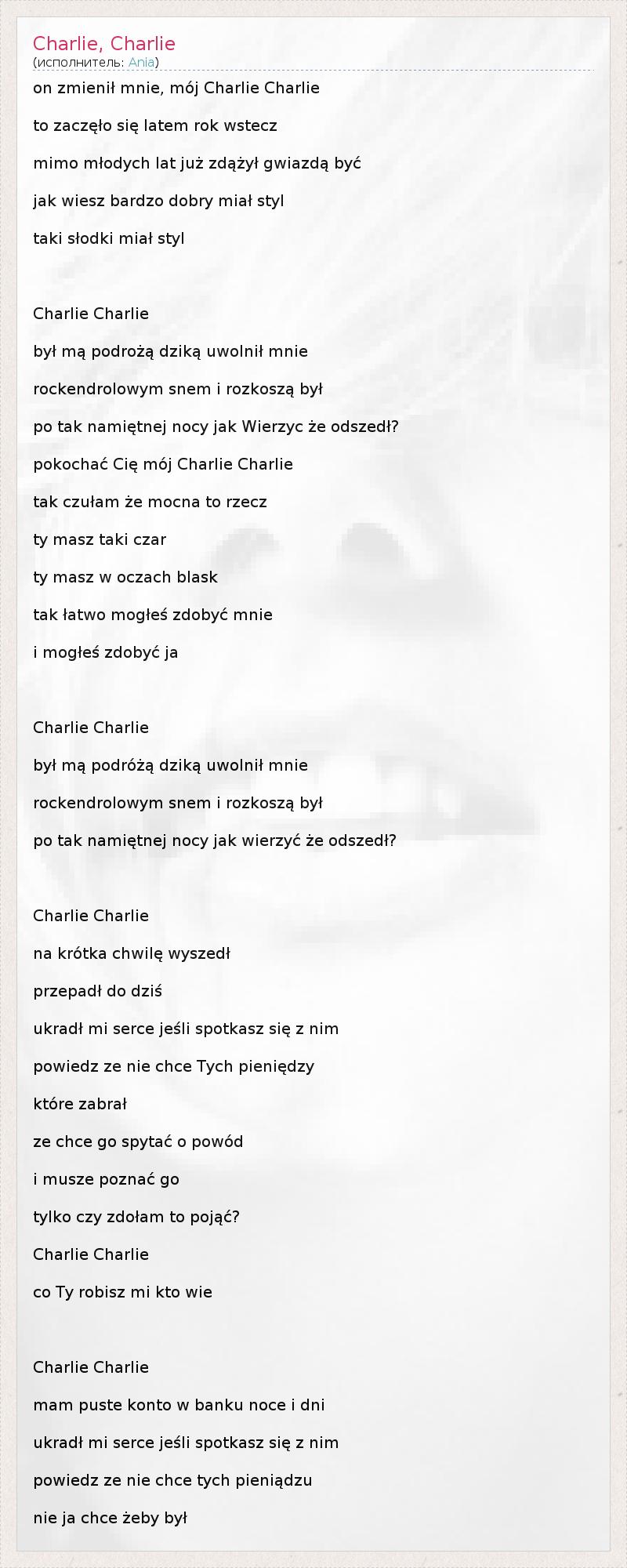 on zmienił mnie, mój Charlie Charlie to zaczęło się latem rok wstecz mimo młodych lat już zdążył gwiazdą być jak wiesz bardzo dobry miał styl taki słodki miał styl Charlie Charlie był mą podrożą dziką uwolnił mnie rockendrolowym snem i rozkoszą był po tak namiętnej nocy jak Wierzyc że odszedł? pokochać Cię mój Charlie Charlie tak czułam że mocna to rzecz ty masz taki czar ty masz w oczach blask tak łatwo mogłeś zdobyć mnie i mogłeś zdobyć ja Charlie Charlie był mą podróżą dziką uwolnił mnie rockendrolowym snem i rozkoszą był po tak namiętnej nocy jak wierzyć że odszedł? Charlie Charlie na krótka chwilę wyszedł przepadł do dziś ukradł mi serce jeśli spotkasz się z nim powiedz ze nie chce Tych pieniędzy które zabrał ze chce go spytać o powód i musze poznać go tylko czy zdołam to pojąć? Charlie Charlie co Ty robisz mi kto wie Charlie Charlie mam puste konto w banku noce i dni ukradł mi serce jeśli spotkasz się z nim powiedz ze nie chce tych pieniądzu nie ja chce żeby był