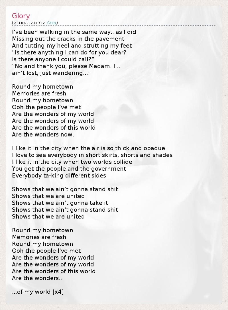 I've been walking in the same way.. as I did Missing out the cracks in the pavement And tutting my heel and strutting my feet "Is there anything I can do for you dear? Is there anyone I could call?" "No and thank you, please Madam. I... ain't lost, just wandering..." Round my hometown Memories are fresh Round my hometown Ooh the people I've met Are the wonders of my world Are the wonders of my world Are the wonders of this world Are the wonders now.. I like it in the city when the air is so thick and opaque I love to see everybody in short skirts, shorts and shades I like it in the city when two worlds collide You get the people and the government Everybody ta-king different sides Shows that we ain't gonna stand shit Shows that we are united Shows that we ain't gonna take it Shows that we ain't gonna stand shit Shows that we are united Round my hometown Memories are fresh Round my hometown Ooh the people I've met Are the wonders of my world Are the wonders of my world Are the wonders of this world Are the wonders... ...of my world [х4]