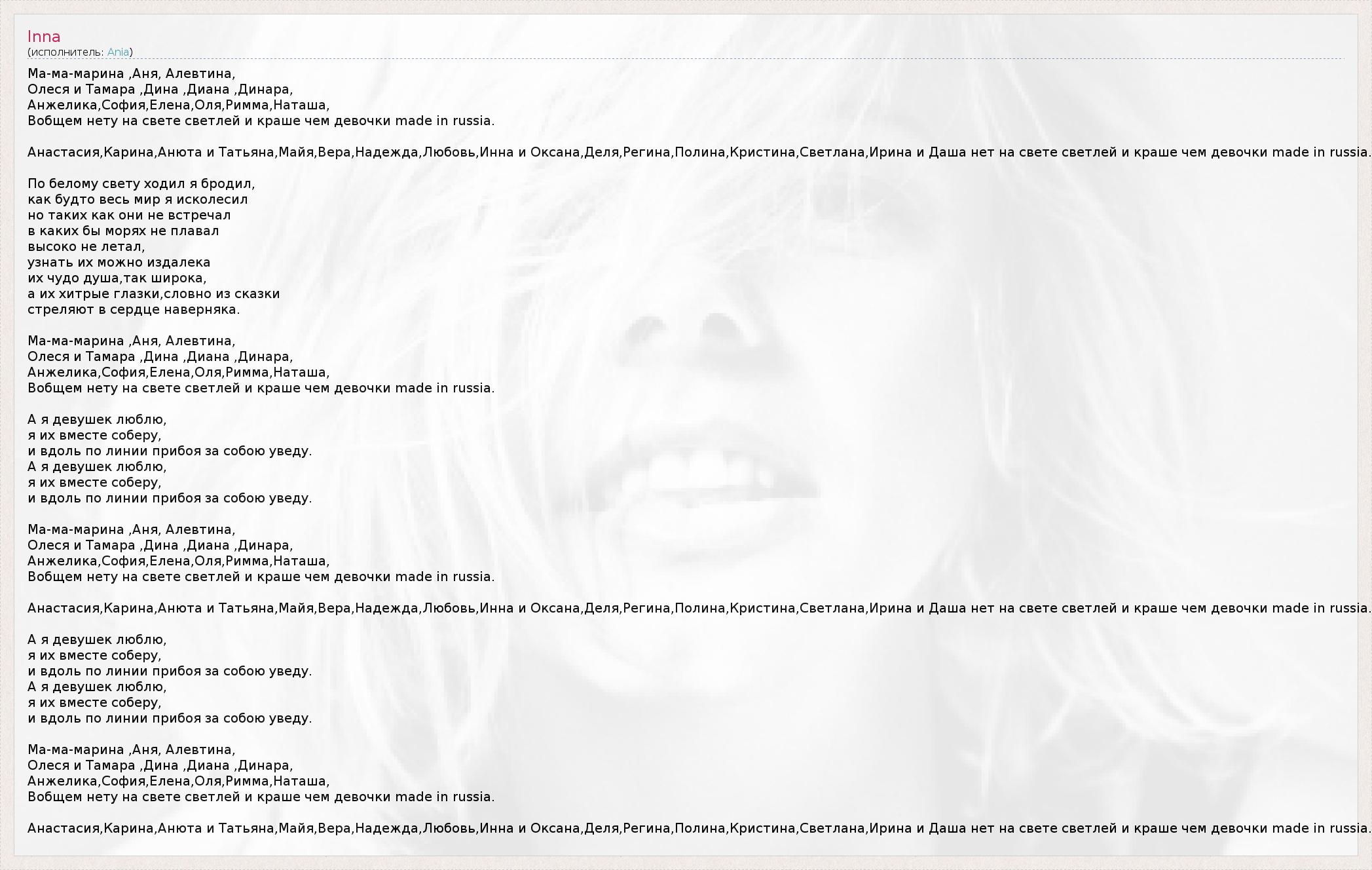 Анастасия,Карина,Анюта и Татьяна,Майя,Вера,Надежда,Любовь,Инна и Оксана,Деля,Регина,Полина,Кристина,Светлана,Ирина и Даша нет на свете светлей и краше чем девочки made in russia.