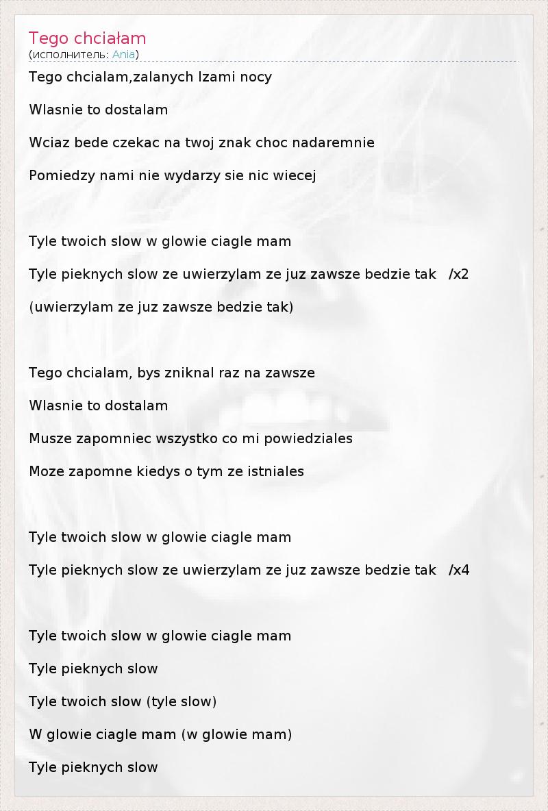 Tego chcialam,zalanych lzami nocy Wlasnie to dostalam Wciaz bede czekac na twoj znak choc nadaremnie Pomiedzy nami nie wydarzy sie nic wiecej Tyle twoich slow w glowie ciagle mam Tyle pieknych slow ze uwierzylam ze juz zawsze bedzie tak /x2 (uwierzylam ze juz zawsze bedzie tak) Tego chcialam, bys zniknal raz na zawsze Wlasnie to dostalam Musze zapomniec wszystko co mi powiedziales Moze zapomne kiedys o tym ze istniales Tyle twoich slow w glowie ciagle mam Tyle pieknych slow ze uwierzylam ze juz zawsze bedzie tak /x4 Tyle twoich slow w glowie ciagle mam Tyle pieknych slow Tyle twoich slow (tyle slow) W glowie ciagle mam (w glowie mam) Tyle pieknych slow