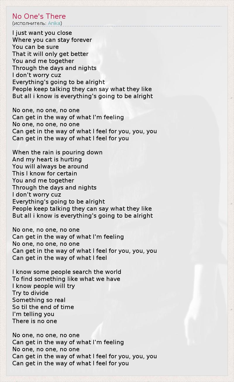 I just want you close Where you can stay forever You can be sure That it will only get better You and me together Through the days and nights I don't worry cuz Everything's going to be alright People keep talking they can say what they like But all i know is everything's going to be alright No one, no one, no one Can get in the way of what I'm feeling No one, no one, no one Can get in the way of what I feel for you, you, you Can get in the way of what I feel for you When the rain is pouring down And my heart is hurting You will always be around This I know for certain You and me together Through the days and nights I don't worry cuz Everything's going to be alright People keep talking they can say what they like But all i know is everything's going to be alright No one, no one, no one Can get in the way of what I'm feeling No one, no one, no one Can get in the way of what I feel for you, you, you Can get in the way of what I feel I know some people search the world To find something like what we have I know people will try Try to divide Something so real So til the end of time I'm telling you There is no one No one, no one, no one Can get in the way of what I'm feeling No one, no one, no one Can get in the way of what I feel for you, you, you Can get in the way of what I feel for you