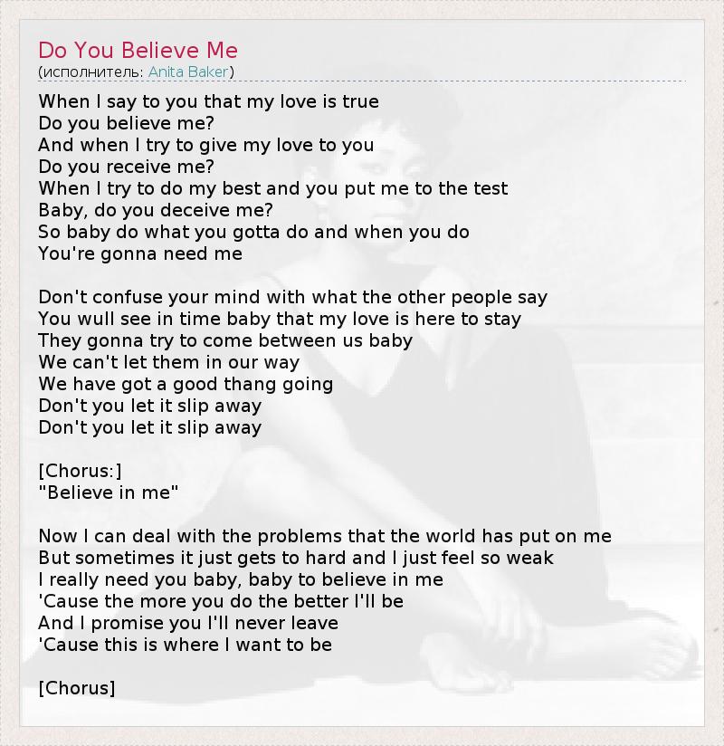 When I say to you that my love is true Do you believe me? And when I try to give my love to you Do you receive me? When I try to do my best and you put me to the test Baby, do you deceive me? So baby do what you gotta do and when you do You're gonna need me Don't confuse your mind with what the other people say You wull see in time baby that my love is here to stay They gonna try to come between us baby We can't let them in our way We have got a good thang going Don't you let it slip away Don't you let it slip away [Chorus:] "Believe in me" Now I can deal with the problems that the world has put on me But sometimes it just gets to hard and I just feel so weak I really need you baby, baby to believe in me 'Cause the more you do the better I'll be And I promise you I'll never leave 'Cause this is where I want to be [Chorus]