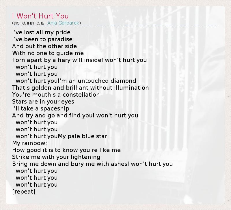 I've lost all my pride I've been to paradise And out the other side With no one to guide me Torn apart by a fiery will insideI won't hurt you I won't hurt you I won't hurt you I won't hurt youI'm an untouched diamond That's golden and brilliant without illumination You're mouth's a constellation Stars are in your eyes I'll take a spaceship And try and go and find youI won't hurt you I won't hurt you I won't hurt you I won't hurt youMy pale blue star My rainbow; How good it is to know you're like me Strike me with your lightening Bring me down and bury me with ashesI won't hurt you I won't hurt you I won't hurt you I won't hurt you [repeat]
