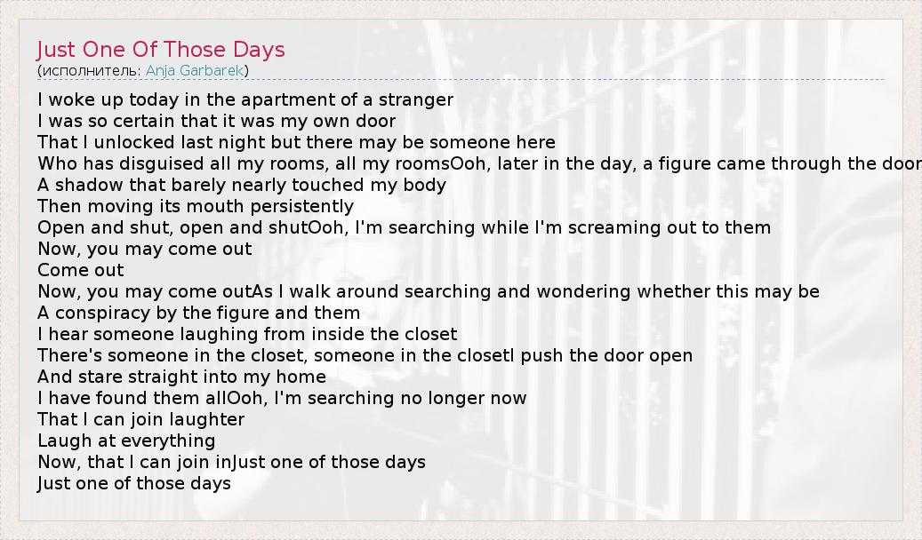 I woke up today in the apartment of a stranger I was so certain that it was my own door That I unlocked last night but there may be someone here Who has disguised all my rooms, all my roomsOoh, later in the day, a figure came through the door A shadow that barely nearly touched my body Then moving its mouth persistently Open and shut, open and shutOoh, I'm searching while I'm screaming out to them Now, you may come out Come out Now, you may come outAs I walk around searching and wondering whether this may be A conspiracy by the figure and them I hear someone laughing from inside the closet There's someone in the closet, someone in the closetI push the door open And stare straight into my home I have found them allOoh, I'm searching no longer now That I can join laughter Laugh at everything Now, that I can join inJust one of those days Just one of those days