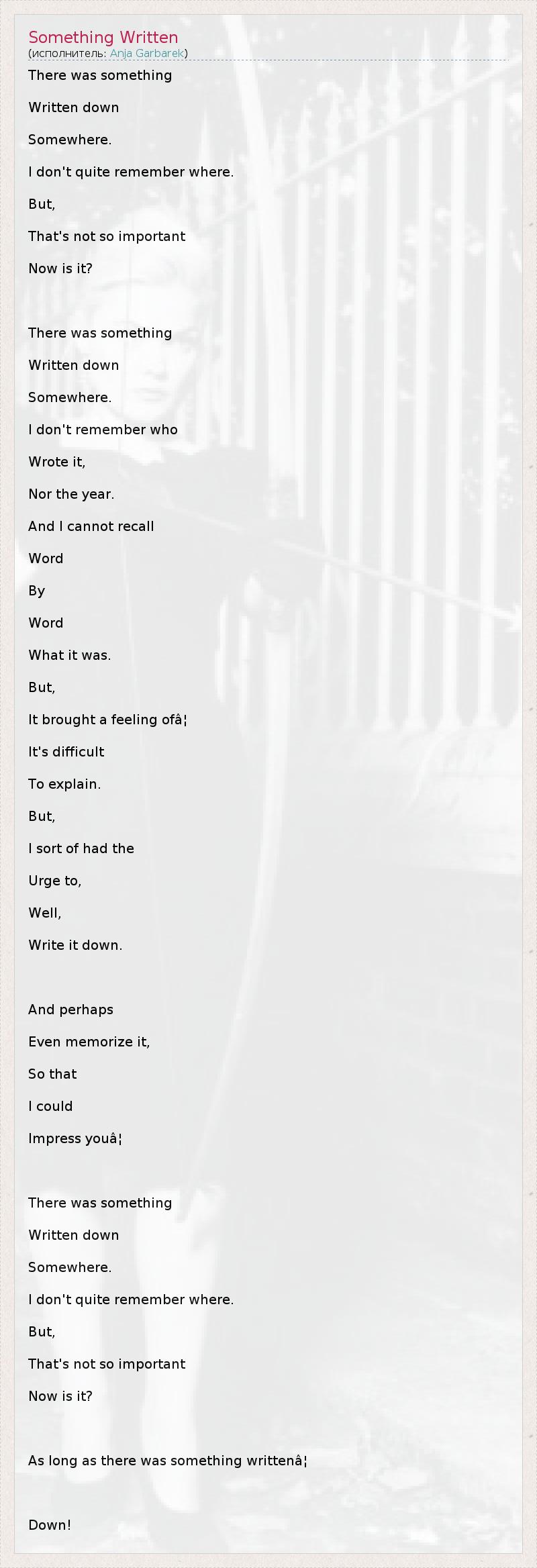There was something Written down Somewhere. I don't quite remember where. But, That's not so important Now is it? There was something Written down Somewhere. I don't remember who Wrote it, Nor the year. And I cannot recall Word By Word What it was. But, It brought a feeling of⦠It's difficult To explain. But, I sort of had the Urge to, Well, Write it down. And perhaps Even memorize it, So that I could Impress you⦠There was something Written down Somewhere. I don't quite remember where. But, That's not so important Now is it? As long as there was something written⦠Down!