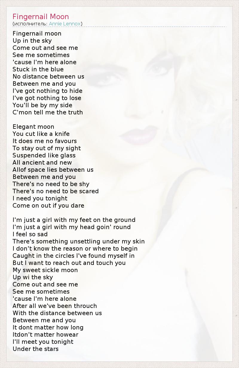 Fingernail moon Up in the sky Come out and see me See me sometimes 'cause I'm here alone Stuck in the blue No distance between us Between me and you I've got nothing to hide I've got nothing to lose You'll be by my side C'mon tell me the truth Elegant moon You cut like a knife It does me no favours To stay out of my sight Suspended like glass All ancient and new Allof space lies between us Between me and you There's no need to be shy There's no need to be scared I need you tonight Come on out if you dare I'm just a girl with my feet on the ground I'm just a girl with my head goin' round I feel so sad There's something unsettling under my skin I don't know the reason or where to begin Caught in the circles I've found myself in But I want to reach out and touch you My sweet sickle moon Up wi the sky Come out and see me See me sometimes 'cause I'm here alone After all we've been throuch With the distance between us Between me and you It dont matter how long Itdon't matter howear I'll meet you tonight Under the stars
