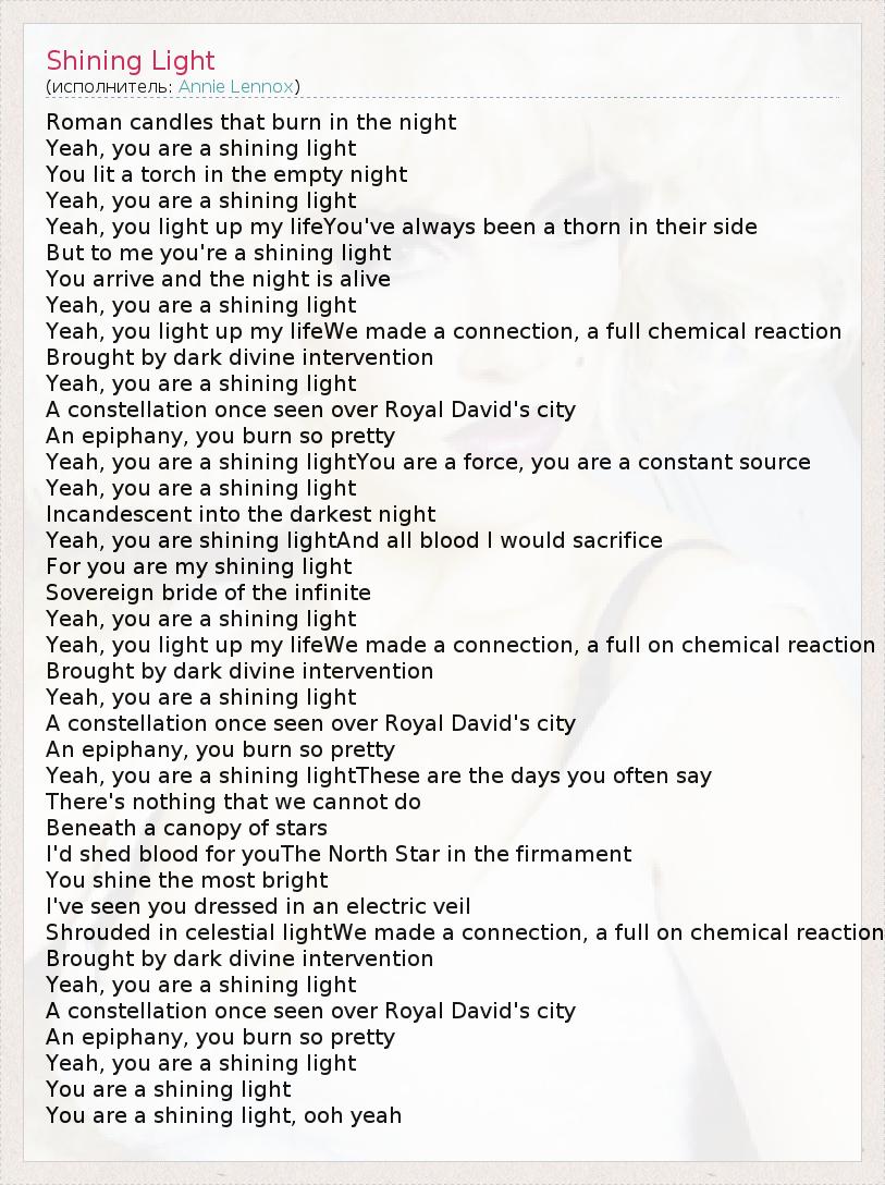 Roman candles that burn in the night Yeah, you are a shining light You lit a torch in the empty night Yeah, you are a shining light Yeah, you light up my lifeYou've always been a thorn in their side But to me you're a shining light You arrive and the night is alive Yeah, you are a shining light Yeah, you light up my lifeWe made a connection, a full chemical reaction Brought by dark divine intervention Yeah, you are a shining light A constellation once seen over Royal David's city An epiphany, you burn so pretty Yeah, you are a shining lightYou are a force, you are a constant source Yeah, you are a shining light Incandescent into the darkest night Yeah, you are shining lightAnd all blood I would sacrifice For you are my shining light Sovereign bride of the infinite Yeah, you are a shining light Yeah, you light up my lifeWe made a connection, a full on chemical reaction Brought by dark divine intervention Yeah, you are a shining light A constellation once seen over Royal David's city An epiphany, you burn so pretty Yeah, you are a shining lightThese are the days you often say There's nothing that we cannot do Beneath a canopy of stars I'd shed blood for youThe North Star in the firmament You shine the most bright I've seen you dressed in an electric veil Shrouded in celestial lightWe made a connection, a full on chemical reaction Brought by dark divine intervention Yeah, you are a shining light A constellation once seen over Royal David's city An epiphany, you burn so pretty Yeah, you are a shining light You are a shining light You are a shining light, ooh yeah