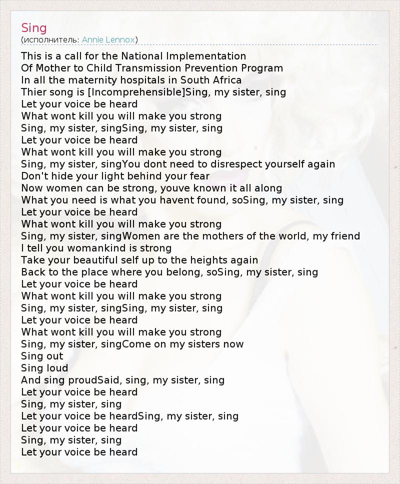 This is a call for the National Implementation Of Mother to Child Transmission Prevention Program In all the maternity hospitals in South Africa Thier song is [Incomprehensible]Sing, my sister, sing Let your voice be heard What wont kill you will make you strong Sing, my sister, singSing, my sister, sing Let your voice be heard What wont kill you will make you strong Sing, my sister, singYou dont need to disrespect yourself again Don't hide your light behind your fear Now women can be strong, youve known it all along What you need is what you havent found, soSing, my sister, sing Let your voice be heard What wont kill you will make you strong Sing, my sister, singWomen are the mothers of the world, my friend I tell you womankind is strong Take your beautiful self up to the heights again Back to the place where you belong, soSing, my sister, sing Let your voice be heard What wont kill you will make you strong Sing, my sister, singSing, my sister, sing Let your voice be heard What wont kill you will make you strong Sing, my sister, singCome on my sisters now Sing out Sing loud And sing proudSaid, sing, my sister, sing Let your voice be heard Sing, my sister, sing Let your voice be heardSing, my sister, sing Let your voice be heard Sing, my sister, sing Let your voice be heard