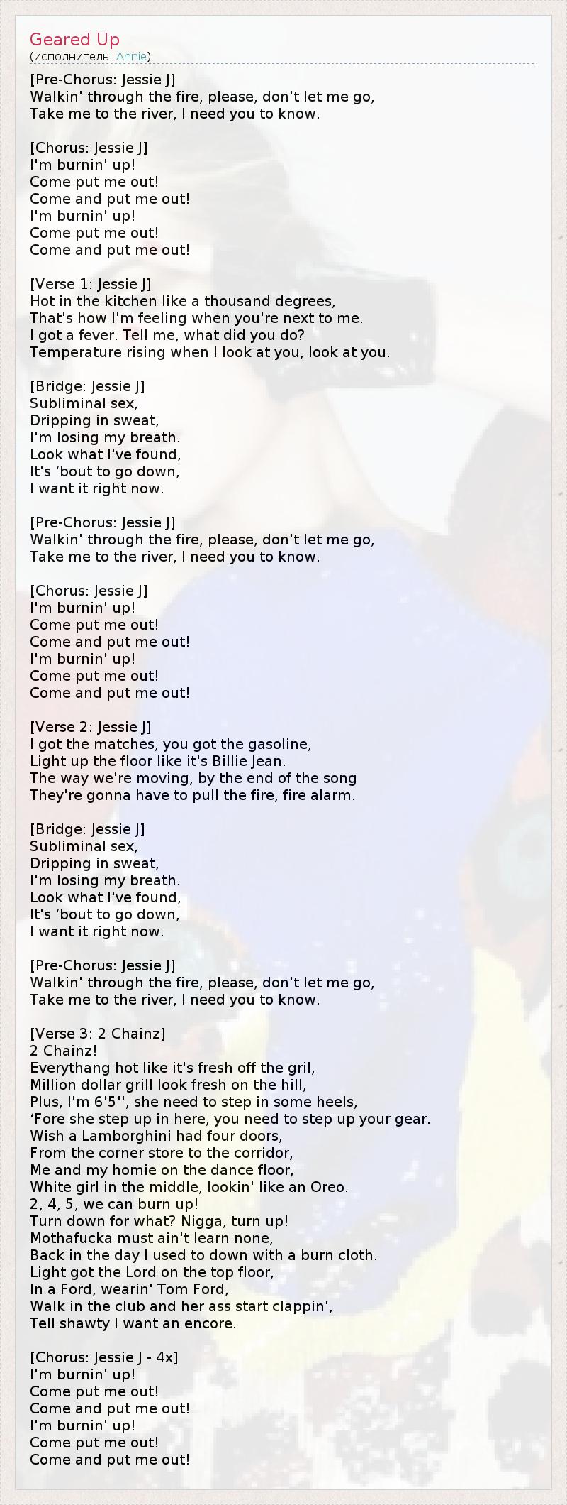 [Распевка: Jessie J] Я иду сквозь огонь, пожалуйста, не отпускай меня, Доведи меня до реки, мне нужно, чтобы ты знал... [Припев: Jessie J] Я пылаю! Приди, погаси меня! Приди и погаси меня! Я пылаю! Приди, погаси меня! Приди и погаси меня! [Куплет 1: Jessie J] На кухне настоящий зной, наверное, тысяча градусов — Так я чувствую себя, когда ты рядом. У меня жар. Скажи, что ты такого сделал — Температура подскакивает, когда я смотрю на тебя. [Связка: Jessie J] Намекаю на секс, Капает пот, У меня перехватывает дыхание. Посмотри, что я нашла, Сейчас всё начнётся, Я хочу этого немедленно. [Распевка: Jessie J] Я иду сквозь огонь, пожалуйста, не отпускай меня, Доведи меня до реки, мне нужно, чтобы ты знал... [Припев: Jessie J] Я пылаю! Приди, погаси меня! Приди и погаси меня! Я пылаю! Приди, погаси меня! Приди и погаси меня! [Куплет 2: Jessie J] У меня есть спички, а у тебя — бензин, Зажжём же танцпол, как в "Билли Джин". 1 Мы так танцуем, что к концу песни Придётся бить пожарную тревогу. [Связка: Jessie J] Намекаю на секс, Капает пот, У меня перехватывает дыхание. Посмотри, что я нашла, Сейчас всё начнётся, Я хочу этого немедленно. [Распевка: Jessie J] Я иду сквозь огонь, пожалуйста, не отпускай меня, Доведи меня до реки, мне нужно, чтобы ты знал... [Куплет 3: 2 Chainz] Ту-Чейнз! Всё пылает, будто только с плиты, Накладки за миллион долларов круто выглядят у меня на зубах, К тому же, во мне метр девяносто пять: ей придётся надеть каблуки, Прежде чем подтягиваться сюда, тебе нужно подтянуться в плане моды. Жалко, что в "Ламборджини" не четыре двери, Прошёл путь от магазина на углу до шикарного коридора, Я с братаном на тацполе, Между нами белая девчонка, мы, как "Чоко-пай". Два-четыре-пять, мы можем зажечь! К чему сбавлять? Ниггер, поддай жару! Убл**ки, видать, ничему не научились, Давным-давно я готовил на прожженной скатерти. Свет вознёс Властелина на самый верх, Сижу в "Форде" в Томе Форде, 2 Зашёл в клуб, и она начала хлопать ж**ой, Скажите малышке, что я хочу выхода на бис. [Припев: Jessie J - 4x] Я пылаю! Приди, погаси меня! Приди и погаси меня! Я пылаю! Приди, погаси меня! Приди и погаси меня! 1 — По сюжету клипа на свою знаменитую песню "Billie Jean" с альбома "Thriller" (1982) Майкл Джексон гуляет по улицам города, где под его ногами светятся плиты мостовой. 2 — Томас Карлайл Форд — американский дизайнер и кинорежиссёр, получил широкую известность во время работы в доме моды Gucci.