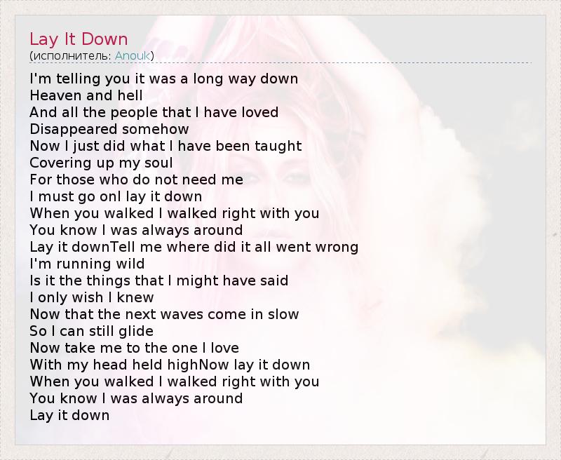 I'm telling you it was a long way down Heaven and hell And all the people that I have loved Disappeared somehow Now I just did what I have been taught Covering up my soul For those who do not need me I must go onI lay it down When you walked I walked right with you You know I was always around Lay it downTell me where did it all went wrong I'm running wild Is it the things that I might have said I only wish I knew Now that the next waves come in slow So I can still glide Now take me to the one I love With my head held highNow lay it down When you walked I walked right with you You know I was always around Lay it down