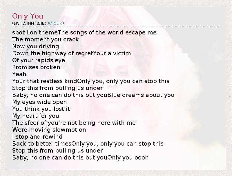 spot lion themeThe songs of the world escape me The moment you crack Now you driving Down the highway of regretYour a victim Of your rapids eye Promises broken Yeah Your that restless kindOnly you, only you can stop this Stop this from pulling us under Baby, no one can do this but youBlue dreams about you My eyes wide open You think you lost it My heart for you The sfeer of you're not being here with me Were moving slowmotion I stop and rewind Back to better timesOnly you, only you can stop this Stop this from pulling us under Baby, no one can do this but youOnly you oooh