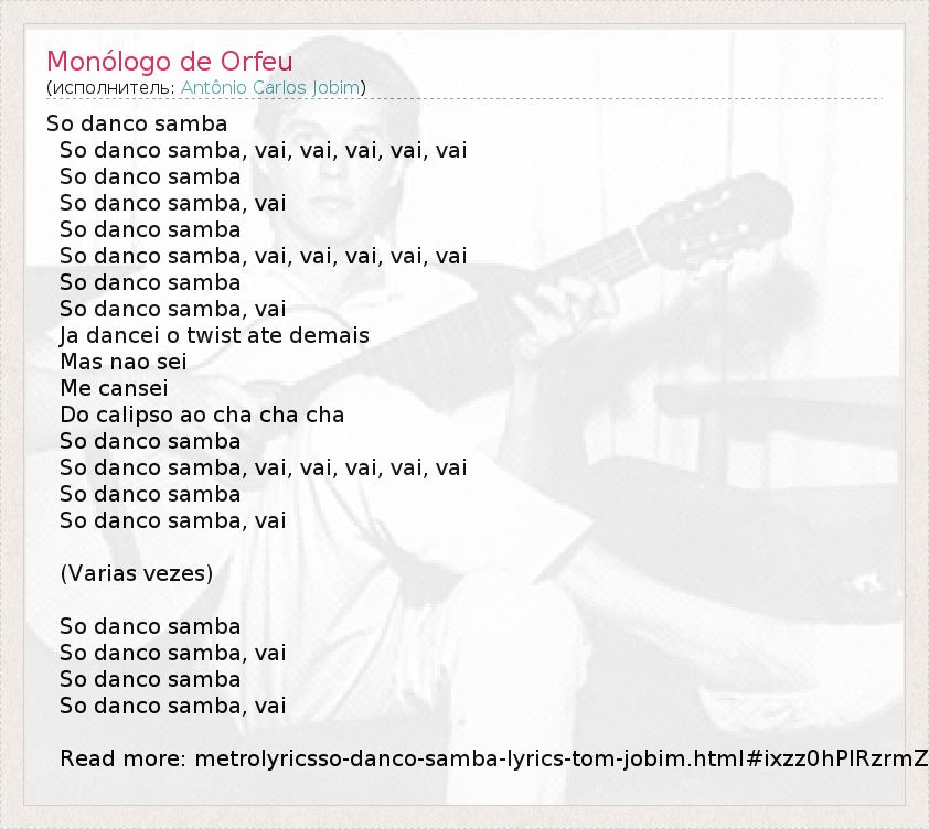 Read more: metrolyricsso-danco-samba-lyrics-tom-jobim.html#ixzz0hPIRzrmZ
