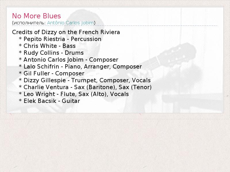 Это интересно:Antônio Carlos Brasileiro de Almeida Jobim(25 января 1927, Рио-де-Жанейро - 8 декабря 1994, Нью-Йорк)Антониу Карлуш Бразилейру ди Алмейда Жобим - правильное произношение на русском/далее текст без изменений/Антонио Карлос Жобим по праву считается основоположником музыкального стиля босса-нова. Точкой отсчета может служить исполнение песни "Chega de Saudade" его другом Жоао Джильберто в 1959 году в... продолжение