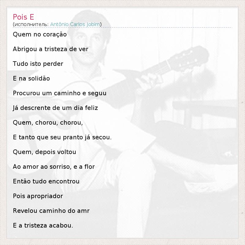 Это интересно:Antônio Carlos Brasileiro de Almeida Jobim(25 января 1927, Рио-де-Жанейро - 8 декабря 1994, Нью-Йорк)Антониу Карлуш Бразилейру ди Алмейда Жобим - правильное произношение на русском/далее текст без изменений/Антонио Карлос Жобим по праву считается основоположником музыкального стиля босса-нова. Точкой отсчета может служить исполнение песни "Chega de Saudade" его другом Жоао Джильберто в 1959 году в... продолжение