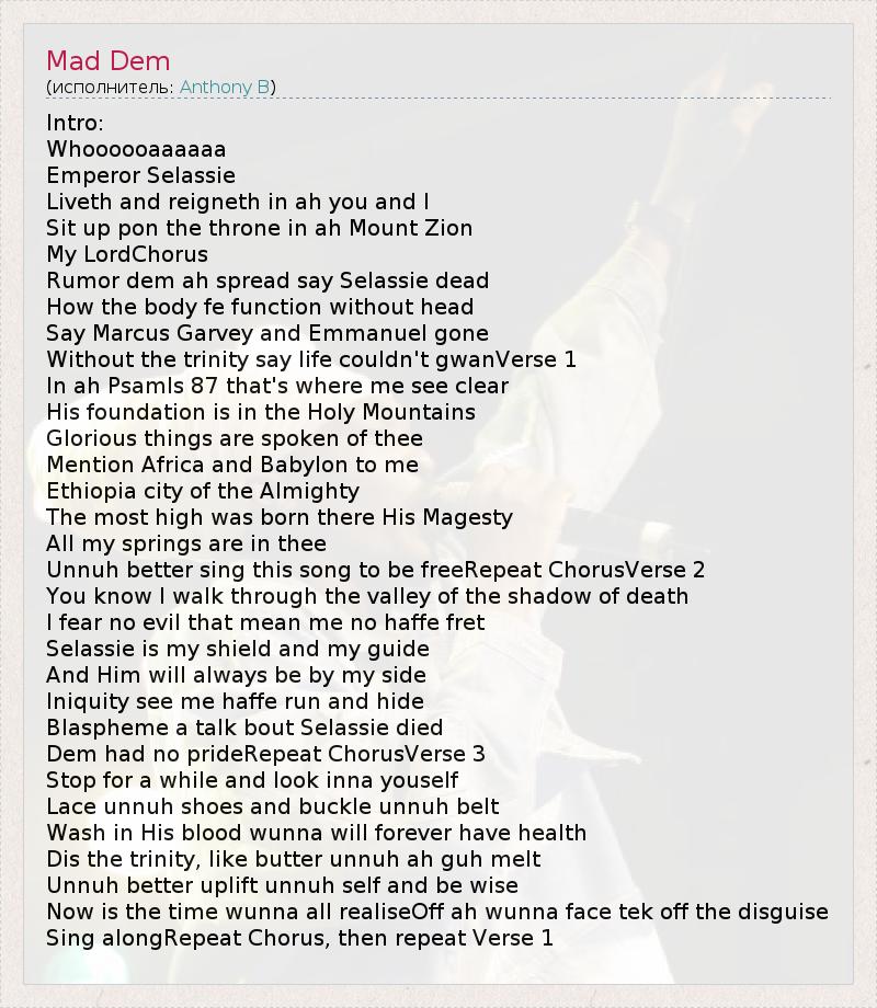Intro: Whoooooaaaaaa Emperor Selassie Liveth and reigneth in ah you and I Sit up pon the throne in ah Mount Zion My LordChorus Rumor dem ah spread say Selassie dead How the body fe function without head Say Marcus Garvey and Emmanuel gone Without the trinity say life couldn't gwanVerse 1 In ah Psamls 87 that's where me see clear His foundation is in the Holy Mountains Glorious things are spoken of thee Mention Africa and Babylon to me Ethiopia city of the Almighty The most high was born there His Magesty All my springs are in thee Unnuh better sing this song to be freeRepeat ChorusVerse 2 You know I walk through the valley of the shadow of death I fear no evil that mean me no haffe fret Selassie is my shield and my guide And Him will always be by my side Iniquity see me haffe run and hide Blaspheme a talk bout Selassie died Dem had no prideRepeat ChorusVerse 3 Stop for a while and look inna youself Lace unnuh shoes and buckle unnuh belt Wash in His blood wunna will forever have health Dis the trinity, like butter unnuh ah guh melt Unnuh better uplift unnuh self and be wise Now is the time wunna all realiseOff ah wunna face tek off the disguise Sing alongRepeat Chorus, then repeat Verse 1