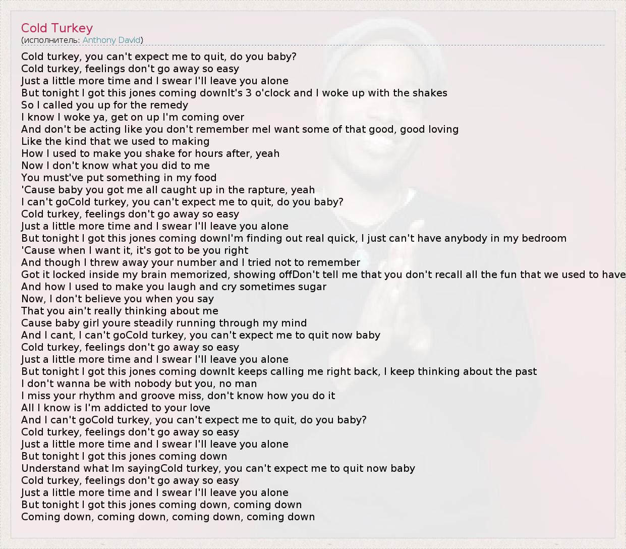 And I cant, I can't goCold turkey, you can't expect me to quit now baby
