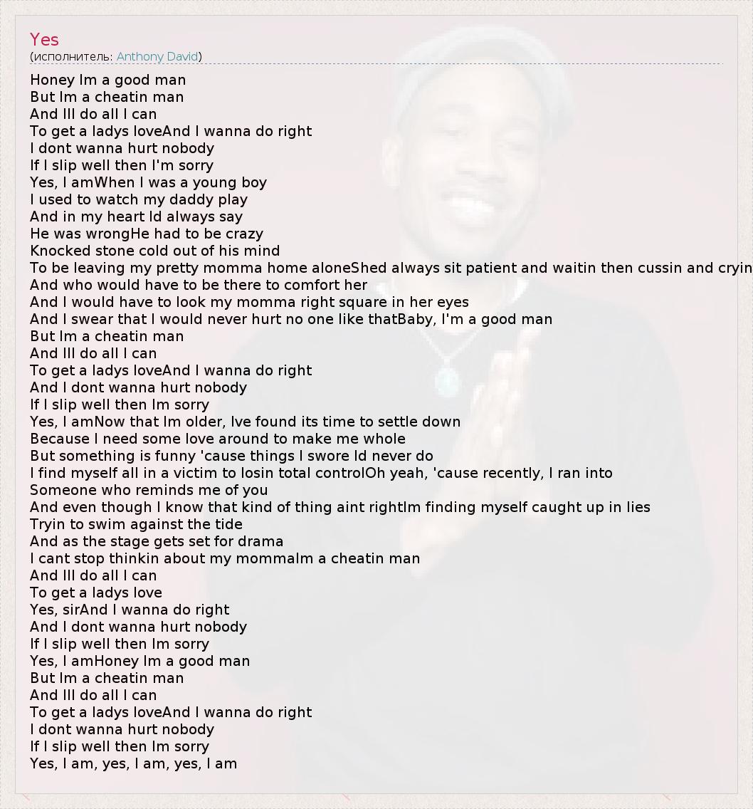 Honey Im a good man But Im a cheatin man And Ill do all I can To get a ladys loveAnd I wanna do right I dont wanna hurt nobody If I slip well then I'm sorry Yes, I amWhen I was a young boy I used to watch my daddy play And in my heart Id always say He was wrongHe had to be crazy Knocked stone cold out of his mind To be leaving my pretty momma home aloneShed always sit patient and waitin then cussin and cryin And who would have to be there to comfort her And I would have to look my momma right square in her eyes And I swear that I would never hurt no one like thatBaby, I'm a good man But Im a cheatin man And Ill do all I can To get a ladys loveAnd I wanna do right And I dont wanna hurt nobody If I slip well then Im sorry Yes, I amNow that Im older, Ive found its time to settle down Because I need some love around to make me whole But something is funny 'cause things I swore Id never do I find myself all in a victim to losin total controlOh yeah, 'cause recently, I ran into Someone who reminds me of you And even though I know that kind of thing aint rightIm finding myself caught up in lies Tryin to swim against the tide And as the stage gets set for drama I cant stop thinkin about my mommaIm a cheatin man And Ill do all I can To get a ladys love Yes, sirAnd I wanna do right And I dont wanna hurt nobody If I slip well then Im sorry Yes, I amHoney Im a good man But Im a cheatin man And Ill do all I can To get a ladys loveAnd I wanna do right I dont wanna hurt nobody If I slip well then Im sorry Yes, I am, yes, I am, yes, I am