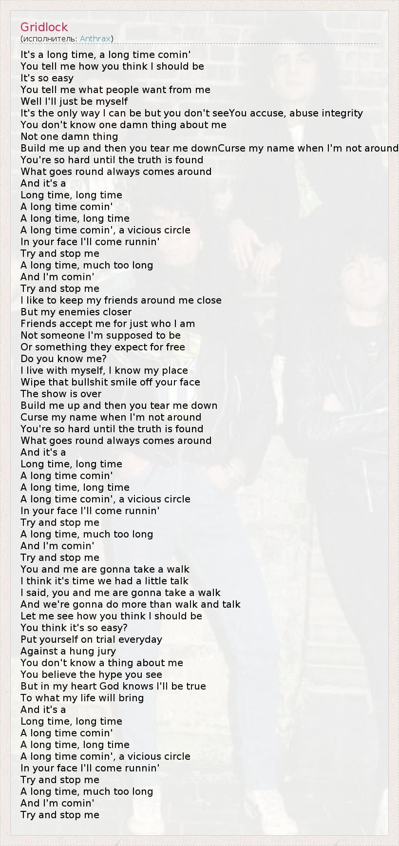 It's a long time, a long time comin' You tell me how you think I should be It's so easy You tell me what people want from me Well I'll just be myself It's the only way I can be but you don't seeYou accuse, abuse integrity You don't know one damn thing about me Not one damn thing Build me up and then you tear me downCurse my name when I'm not around You're so hard until the truth is found What goes round always comes around And it's a Long time, long time A long time comin' A long time, long time A long time comin', a vicious circle In your face I'll come runnin' Try and stop me A long time, much too long And I'm comin' Try and stop me I like to keep my friends around me close But my enemies closer Friends accept me for just who I am Not someone I'm supposed to be Or something they expect for free Do you know me? I live with myself, I know my place Wipe that bullshit smile off your face The show is over Build me up and then you tear me down Curse my name when I'm not around You're so hard until the truth is found What goes round always comes around And it's a Long time, long time A long time comin' A long time, long time A long time comin', a vicious circle In your face I'll come runnin' Try and stop me A long time, much too long And I'm comin' Try and stop me You and me are gonna take a walk I think it's time we had a little talk I said, you and me are gonna take a walk And we're gonna do more than walk and talk Let me see how you think I should be You think it's so easy? Put yourself on trial everyday Against a hung jury You don't know a thing about me You believe the hype you see But in my heart God knows I'll be true To what my life will bring And it's a Long time, long time A long time comin' A long time, long time A long time comin', a vicious circle In your face I'll come runnin' Try and stop me A long time, much too long And I'm comin' Try and stop me