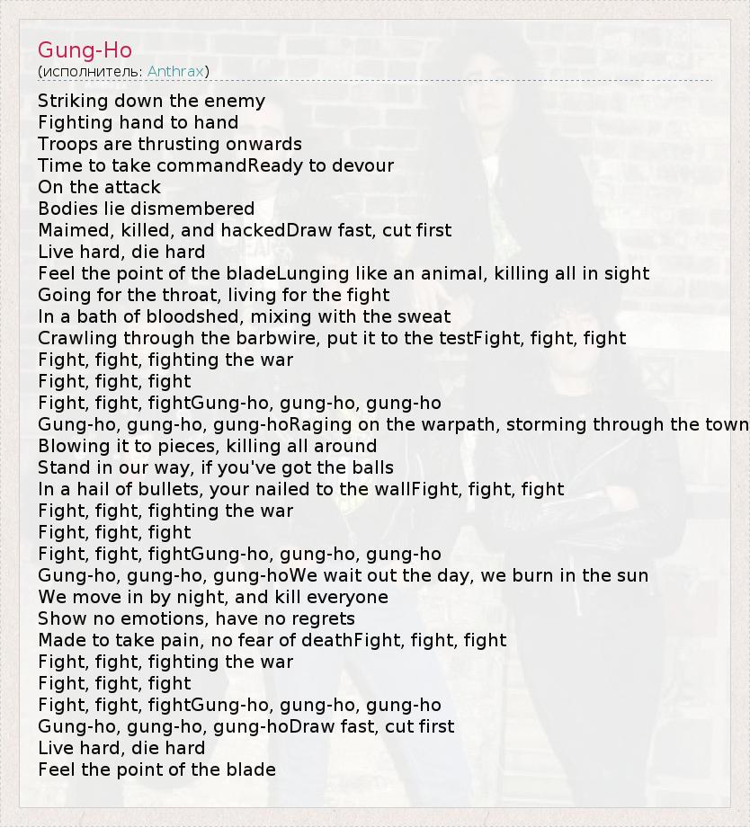 Striking down the enemy Fighting hand to hand Troops are thrusting onwards Time to take commandReady to devour On the attack Bodies lie dismembered Maimed, killed, and hackedDraw fast, cut first Live hard, die hard Feel the point of the bladeLunging like an animal, killing all in sight Going for the throat, living for the fight In a bath of bloodshed, mixing with the sweat Crawling through the barbwire, put it to the testFight, fight, fight Fight, fight, fighting the war Fight, fight, fight Fight, fight, fightGung-ho, gung-ho, gung-ho Gung-ho, gung-ho, gung-hoRaging on the warpath, storming through the town Blowing it to pieces, killing all around Stand in our way, if you've got the balls In a hail of bullets, your nailed to the wallFight, fight, fight Fight, fight, fighting the war Fight, fight, fight Fight, fight, fightGung-ho, gung-ho, gung-ho Gung-ho, gung-ho, gung-hoWe wait out the day, we burn in the sun We move in by night, and kill everyone Show no emotions, have no regrets Made to take pain, no fear of deathFight, fight, fight Fight, fight, fighting the war Fight, fight, fight Fight, fight, fightGung-ho, gung-ho, gung-ho Gung-ho, gung-ho, gung-hoDraw fast, cut first Live hard, die hard Feel the point of the blade