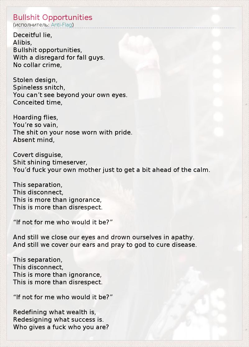 А как ты думаешь, о чем песня "Bullshit Opportunities" ?