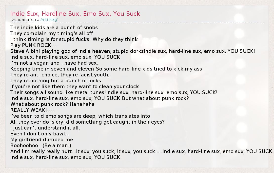 ГлавнаяИсполнителиAnti-FlagIndie Sux, Hardline Sux, Emo Sux, You Suck