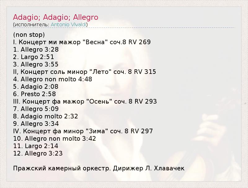 (non stop) I. Концерт ми мажор "Весна" соч.8 RV 269 1. Allegro 3:28 2. Largo 2:51 3. Allegro 3:55 II, Концерт соль минор "Лето" соч. 8 RV 315 4. Allegro non molto 4:48 5. Adagio 2:08 6. Presto 2:58 III. Концерт фа мажор "Осень" соч. 8 RV 293 7. Allegro 5:09 8. Adagio molto 2:32 9. Allegro 3:34 IV. Концерт фа минор "Зима" соч. 8 RV 297 10. Allegro non molto 3:42 11. Largo 2:14 12. Allegro 3:23 Пражский камерный оркестр. Дирижер Л. Хлавачек