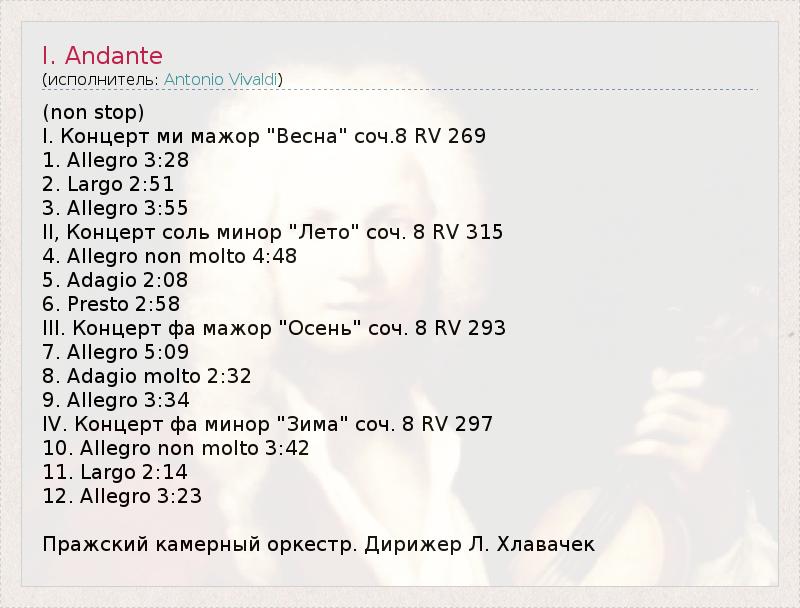 Это интересно:Анто́нио Вива́льди (итал. Antonio Lucio Vivaldi; 4 марта 1678, Венеция — 28 июля 1741, Вена) — итальянский композитор, скрипач, педагог, дирижёр.Учился игре на скрипке у своего отца Джованни Баттисты Вивальди, скрипача собора св. Марка; возможно, композиции — у Джованни Легренци, возможно, также обучался у Арканджело Корелли в Риме.18 сентября 1693 пострижение Вивальди в монахи. 18 сентября 1700 возведен... продолжение