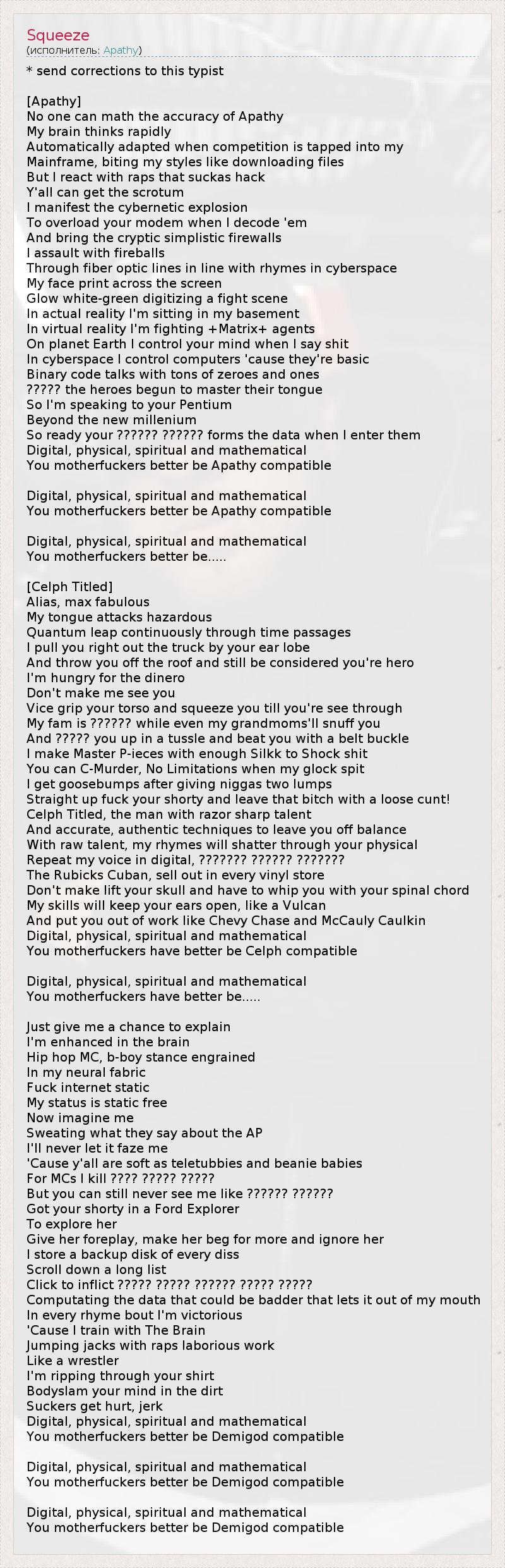 Это интересно:Существует по крайней мере два исполнителя с названием Apathy.1. Рэппер из США. 2. Progressive Death/Doom Metal проект из Швеции.1. Уроженец Коннектикута, участник группировок Demigodz, Army of the pharaohs, Doe Rakers, Get busy committee - Чад Бромли, более известный под сценическим псевдонимом Apathy.Впервые Apathy засветился в альбоме... продолжение