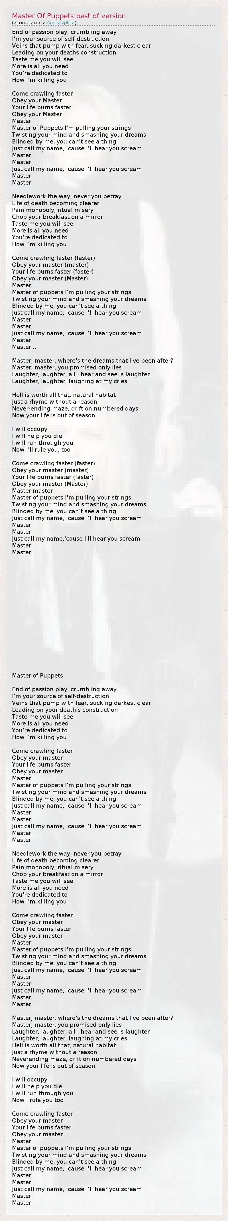 End of passion play, crumbling away I'm your source of self-destruction Veins that pump with fear, sucking darkest clear Leading on your deaths construction Taste me you will see More is all you need You're dedicated to How I'm killing you Come crawling faster Obey your Master Your life burns faster Obey your Master Master Master of Puppets I'm pulling your strings Twisting your mind and smashing your dreams Blinded by me, you can't see a thing Just call my name, 'cause I'll hear you scream Master Master Just call my name, 'cause I'll hear you scream Master Master Needlework the way, never you betray Life of death becoming clearer Pain monopoly, ritual misery Chop your breakfast on a mirror Taste me you will see More is all you need You're dedicated to How I'm killing you Come crawling faster (faster) Obey your master (master) Your life burns faster (faster) Obey your master (Master) Master Master of puppets I'm pulling your strings Twisting your mind and smashing your dreams Blinded by me, you can't see a thing Just call my name, 'cause I'll hear you scream Master Master Just call my name, 'cause I'll hear you scream Master Master ... Master, master, where's the dreams that I've been after? Master, master, you promised only lies Laughter, laughter, all I hear and see is laughter Laughter, laughter, laughing at my cries Hell is worth all that, natural habitat Just a rhyme without a reason Never-ending maze, drift on numbered days Now your life is out of season I will occupy I will help you die I will run through you Now I'll rule you, too Come crawling faster (faster) Obey your master (master) Your life burns faster (faster) Obey your master (Master) Master master Master of puppets I'm pulling your strings Twisting your mind and smashing your dreams Blinded by me, you can't see a thing Just call my name, 'cause I'll hear you scream Master Master Just call my name,'cause I'll hear you scream Master Master Master of Puppets End of passion play, crumbling away I'm your source of self-destruction Veins that pump with fear, sucking darkest clear Leading on your death’s construction Taste me you will see More is all you need You're dedicated to How I'm killing you Come crawling faster Obey your master Your life burns faster Obey your master Master Master of puppets I'm pulling your strings Twisting your mind and smashing your dreams Blinded by me, you can't see a thing Just call my name, 'cause I'll hear you scream Master Master Just call my name, 'cause I'll hear you scream Master Master Needlework the way, never you betray Life of death becoming clearer Pain monopoly, ritual misery Chop your breakfast on a mirror Taste me you will see More is all you need You're dedicated to How I'm killing you Come crawling faster Obey your master Your life burns faster Obey your master Master Master of puppets I'm pulling your strings Twisting your mind and smashing your dreams Blinded by me, you can't see a thing Just call my name, 'cause I'll hear you scream Master Master Just call my name, 'cause I'll hear you scream Master Master Master, master, where's the dreams that I've been after? Master, master, you promised only lies Laughter, laughter, all I hear and see is laughter Laughter, laughter, laughing at my cries Hell is worth all that, natural habitat Just a rhyme without a reason Neverending maze, drift on numbered days Now your life is out of season I will occupy I will help you die I will run through you Now I rule you too Come crawling faster Obey your master Your life burns faster Obey your master Master Master of puppets I'm pulling your strings Twisting your mind and smashing your dreams Blinded by me, you can't see a thing Just call my name, 'cause I'll hear you scream Master Master Just call my name, 'cause I'll hear you scream Master Master