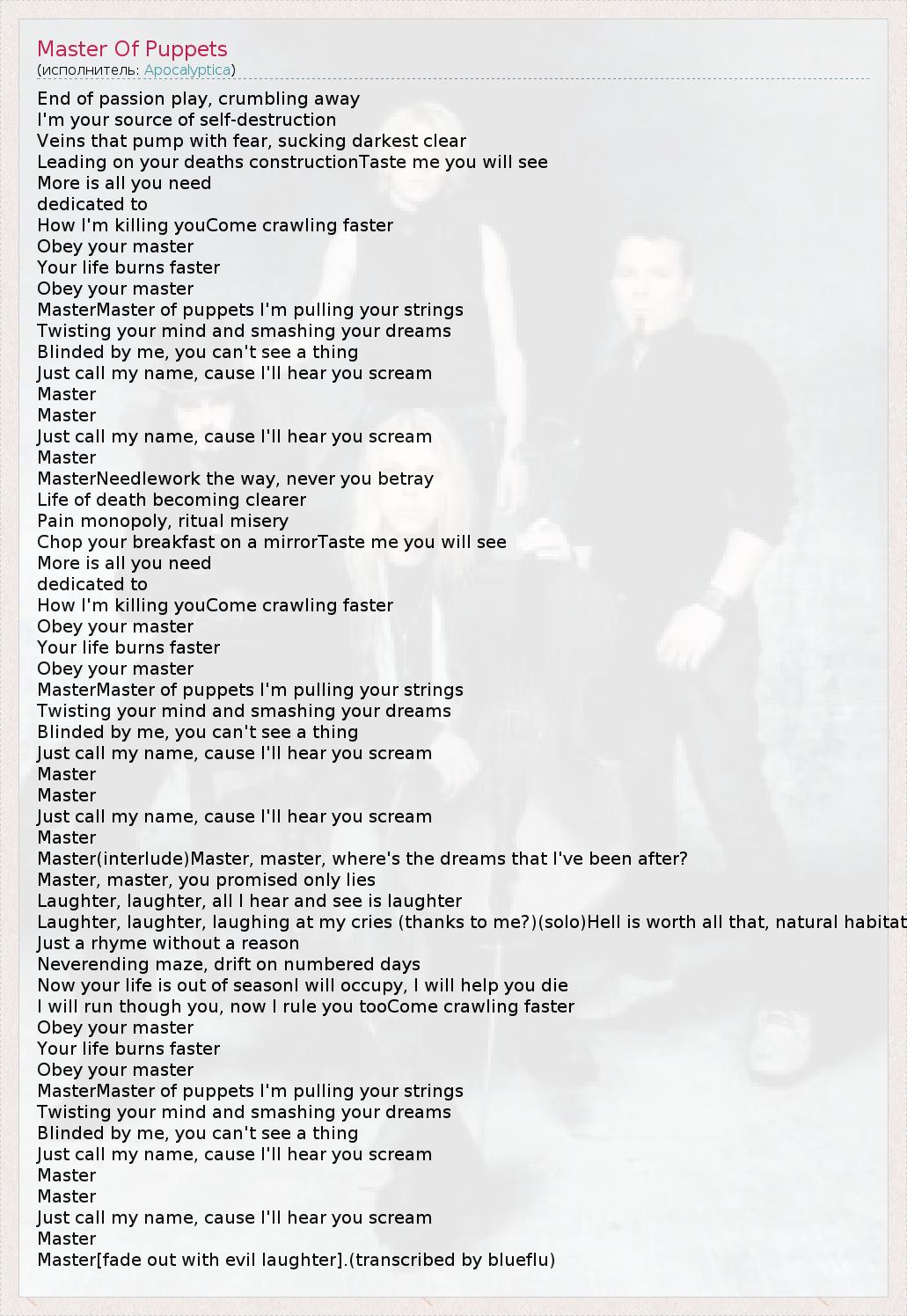 А как ты думаешь, о чем песня "Master Of Puppets" ?