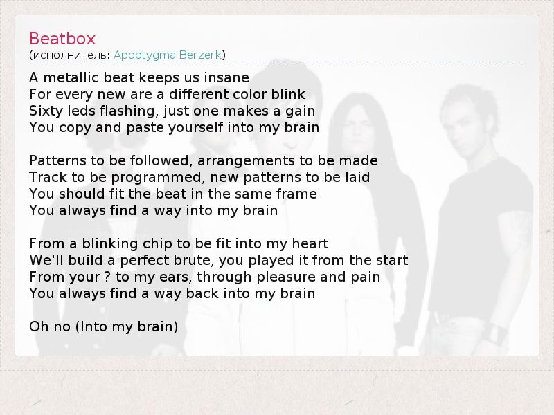 A metallic beat keeps us insane For every new are a different color blink Sixty leds flashing, just one makes a gain You copy and paste yourself into my brain Patterns to be followed, arrangements to be made Track to be programmed, new patterns to be laid You should fit the beat in the same frame You always find a way into my brain From a blinking chip to be fit into my heart We'll build a perfect brute, you played it from the start From your ? to my ears, through pleasure and pain You always find a way back into my brain Oh no (Into my brain)