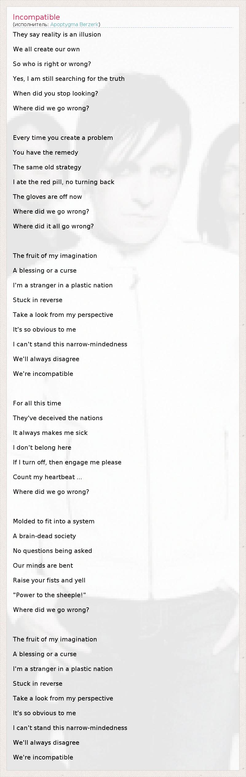 They say reality is an illusion We all create our own So who is right or wrong? Yes, I am still searching for the truth When did you stop looking? Where did we go wrong? Every time you create a problem You have the remedy The same old strategy I ate the red pill, no turning back The gloves are off now Where did we go wrong? Where did it all go wrong? The fruit of my imagination A blessing or a curse I'm a stranger in a plastic nation Stuck in reverse Take a look from my perspective It's so obvious to me I can't stand this narrow-mindedness We'll always disagree We're incompatible For all this time They've deceived the nations It always makes me sick I don't belong here If I turn off, then engage me please Count my heartbeat ... Where did we go wrong? Molded to fit into a system A brain-dead society No questions being asked Our minds are bent Raise your fists and yell "Power to the sheeple!" Where did we go wrong? The fruit of my imagination A blessing or a curse I'm a stranger in a plastic nation Stuck in reverse Take a look from my perspective It's so obvious to me I can't stand this narrow-mindedness We'll always disagree We're incompatible