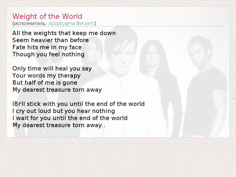А как ты думаешь, о чем песня "Weight of the World" ?