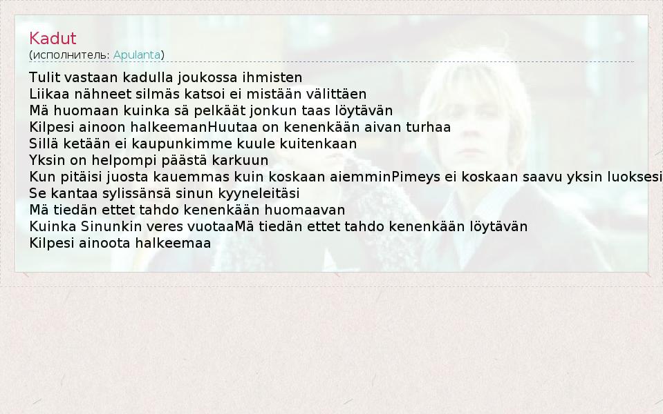 Это интересно:B 1991 году некто Тони (Toni Wirtanen) и Антти (Antti Lautala), два друга из небольшого города Хейнола, решили создать группу. Играть собирались, кажется, что-то вроде death metal. Дело за малым – пригласив приятеля Симо побарабанить, друзья принялись за репетиции. Через год к ним присоединился басист Мэнди, а через два была записана промо-запись Mikä ihmeen Apulanta?. Ну и сразу после этого басист сменился – пришёл Тукка... продолжение