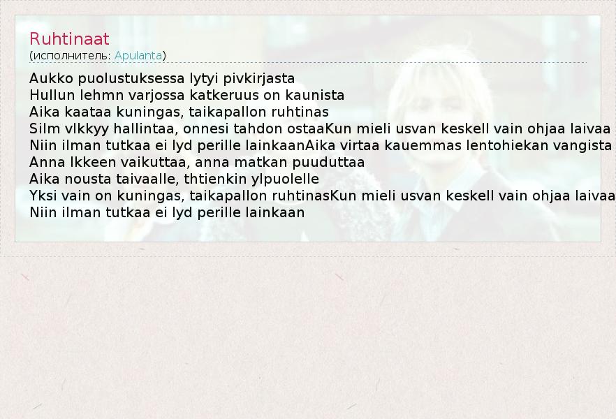 Aukko puolustuksessa lytyi pivkirjasta Hullun lehmn varjossa katkeruus on kaunista Aika kaataa kuningas, taikapallon ruhtinas Silm vlkkyy hallintaa, onnesi tahdon ostaaKun mieli usvan keskell vain ohjaa laivaa Niin ilman tutkaa ei lyd perille lainkaanAika virtaa kauemmas lentohiekan vangista Anna lkkeen vaikuttaa, anna matkan puuduttaa Aika nousta taivaalle, thtienkin ylpuolelle Yksi vain on kuningas, taikapallon ruhtinasKun mieli usvan keskell vain ohjaa laivaa Niin ilman tutkaa ei lyd perille lainkaan