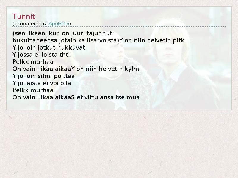 Это интересно:B 1991 году некто Тони (Toni Wirtanen) и Антти (Antti Lautala), два друга из небольшого города Хейнола, решили создать группу. Играть собирались, кажется, что-то вроде death metal. Дело за малым – пригласив приятеля Симо побарабанить, друзья принялись за репетиции. Через год к ним присоединился басист Мэнди, а через два была записана промо-запись Mikä ihmeen Apulanta?. Ну и сразу после этого басист сменился – пришёл Тукка... продолжение