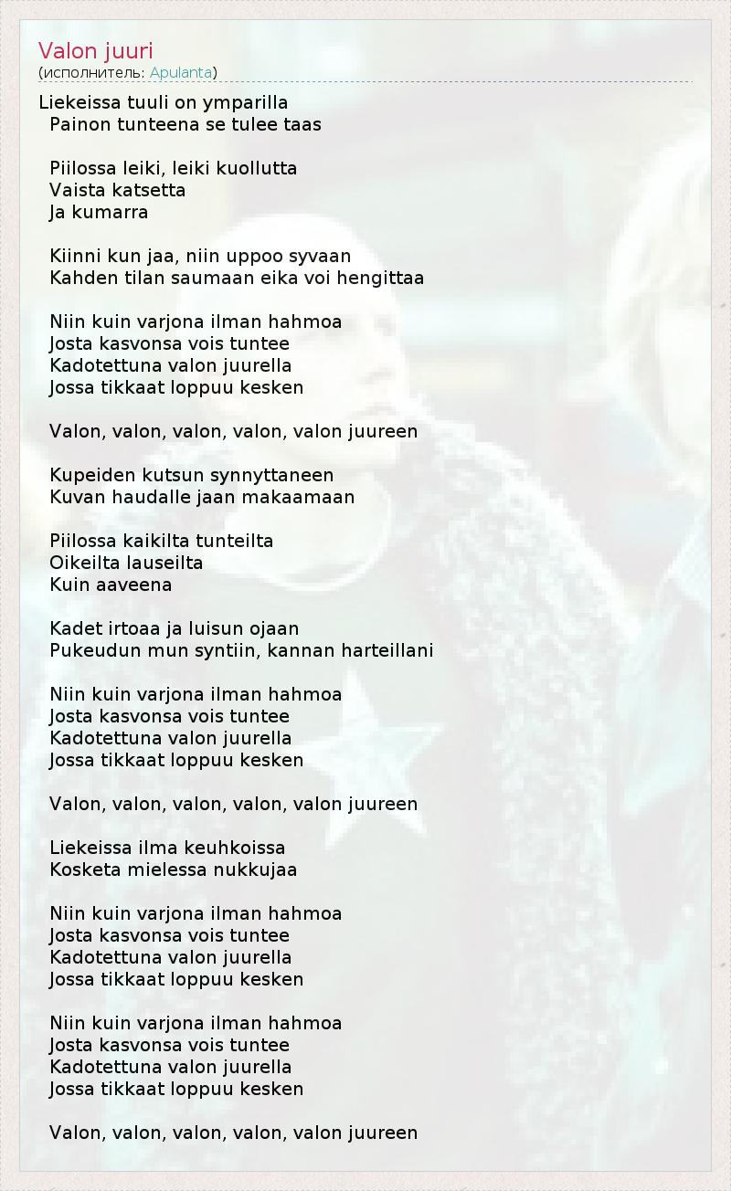 Liekeissa tuuli on ymparilla Painon tunteena se tulee taas Piilossa leiki, leiki kuollutta Vaista katsetta Ja kumarra Kiinni kun jaa, niin uppoo syvaan Kahden tilan saumaan eika voi hengittaa Niin kuin varjona ilman hahmoa Josta kasvonsa vois tuntee Kadotettuna valon juurella Jossa tikkaat loppuu kesken Valon, valon, valon, valon, valon juureen Kupeiden kutsun synnyttaneen Kuvan haudalle jaan makaamaan Piilossa kaikilta tunteilta Oikeilta lauseilta Kuin aaveena Kadet irtoaa ja luisun ojaan Pukeudun mun syntiin, kannan harteillani Niin kuin varjona ilman hahmoa Josta kasvonsa vois tuntee Kadotettuna valon juurella Jossa tikkaat loppuu kesken Valon, valon, valon, valon, valon juureen Liekeissa ilma keuhkoissa Kosketa mielessa nukkujaa Niin kuin varjona ilman hahmoa Josta kasvonsa vois tuntee Kadotettuna valon juurella Jossa tikkaat loppuu kesken Niin kuin varjona ilman hahmoa Josta kasvonsa vois tuntee Kadotettuna valon juurella Jossa tikkaat loppuu kesken Valon, valon, valon, valon, valon juureen